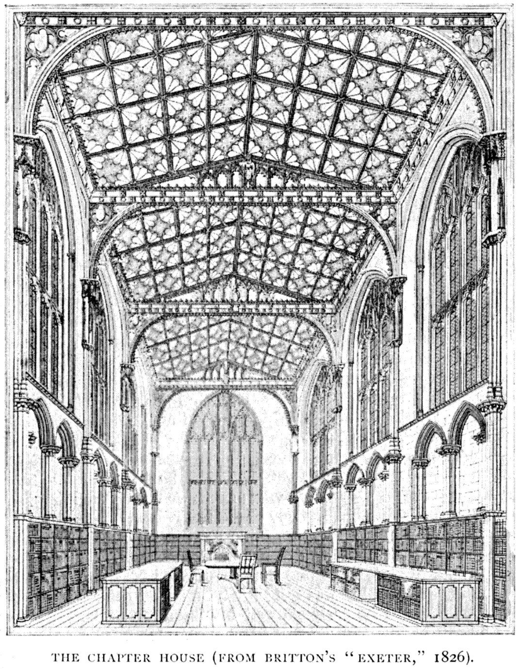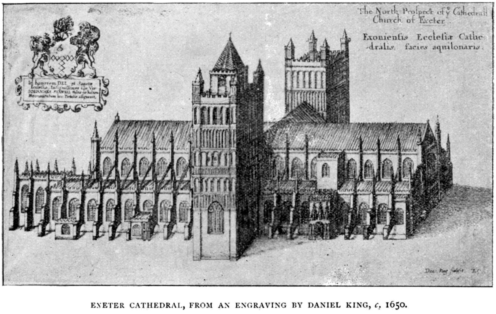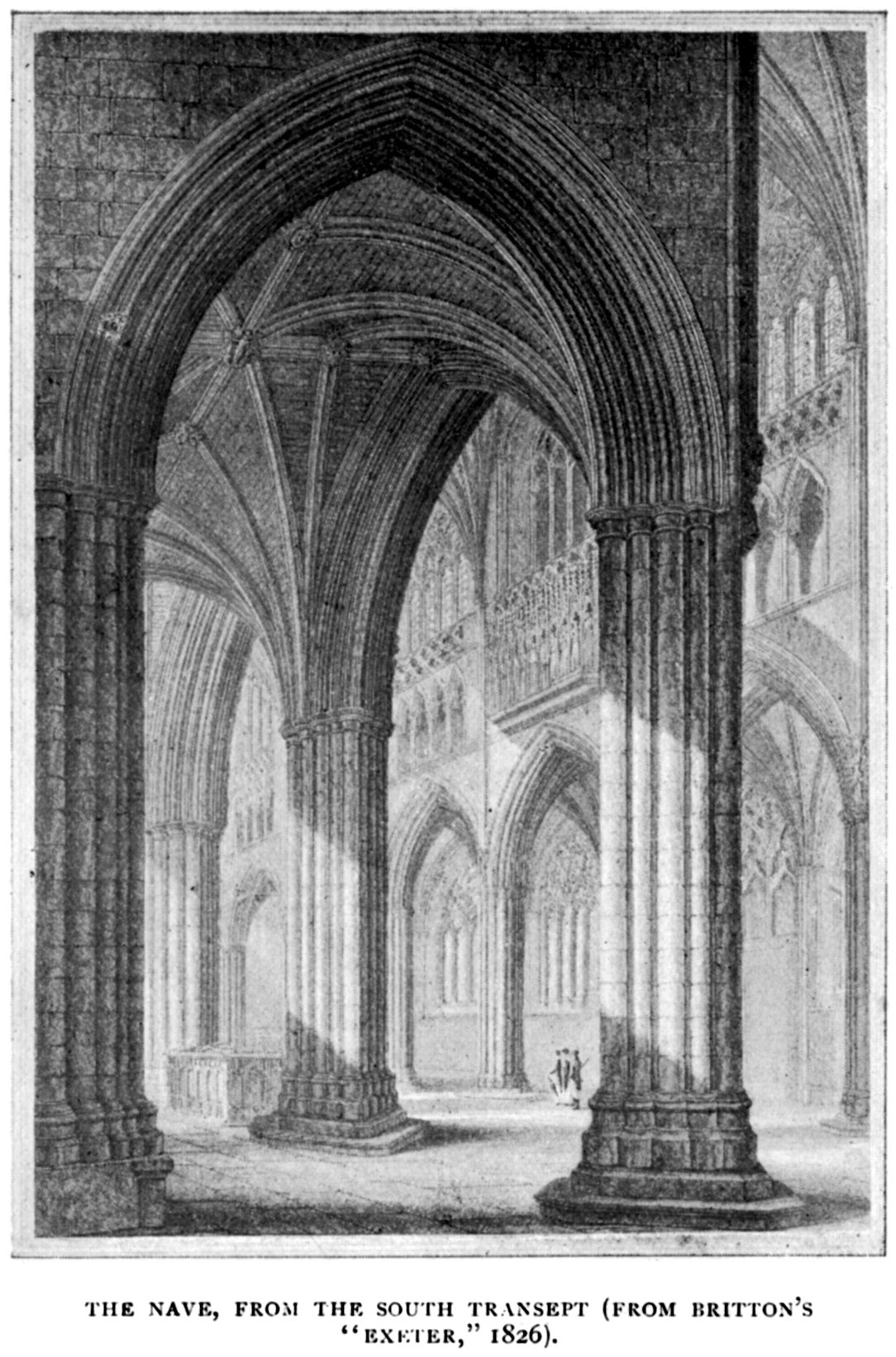 The first record of a church dedicated to SS. Mary and Peter in Exeter, is that of an abbey church founded by [pg 3] Athelstan. But Sweyn destroyed it seventy years later, and it seems frequently to have been attacked by invaders previous to its destruction. But in 1019 Canute endowed a new church and confirmed by charter their lands and privileges to the monks. This building must have been of some pretensions, for it was given to Leofric for his cathedral church in 1050. It occupied the site of the present Lady Chapel. When Warelwast and Marshall built their Norman church they placed it on the east of the old church, leaving an intervening space. Their nave occupied the site of the present nave, the transeptal towers were the same, but the choir was shorter and probably terminated in an apse flanked by smaller apses at the ends of the choir aisles. Traces of one of these have been found at the end of the third bay of the north choir aisle. Bronscombe and Quivil (see p. 5) began their reconstruction at this end, and by adding the ambulatory and Lady Chapel linked together the sites of the old and new churches.