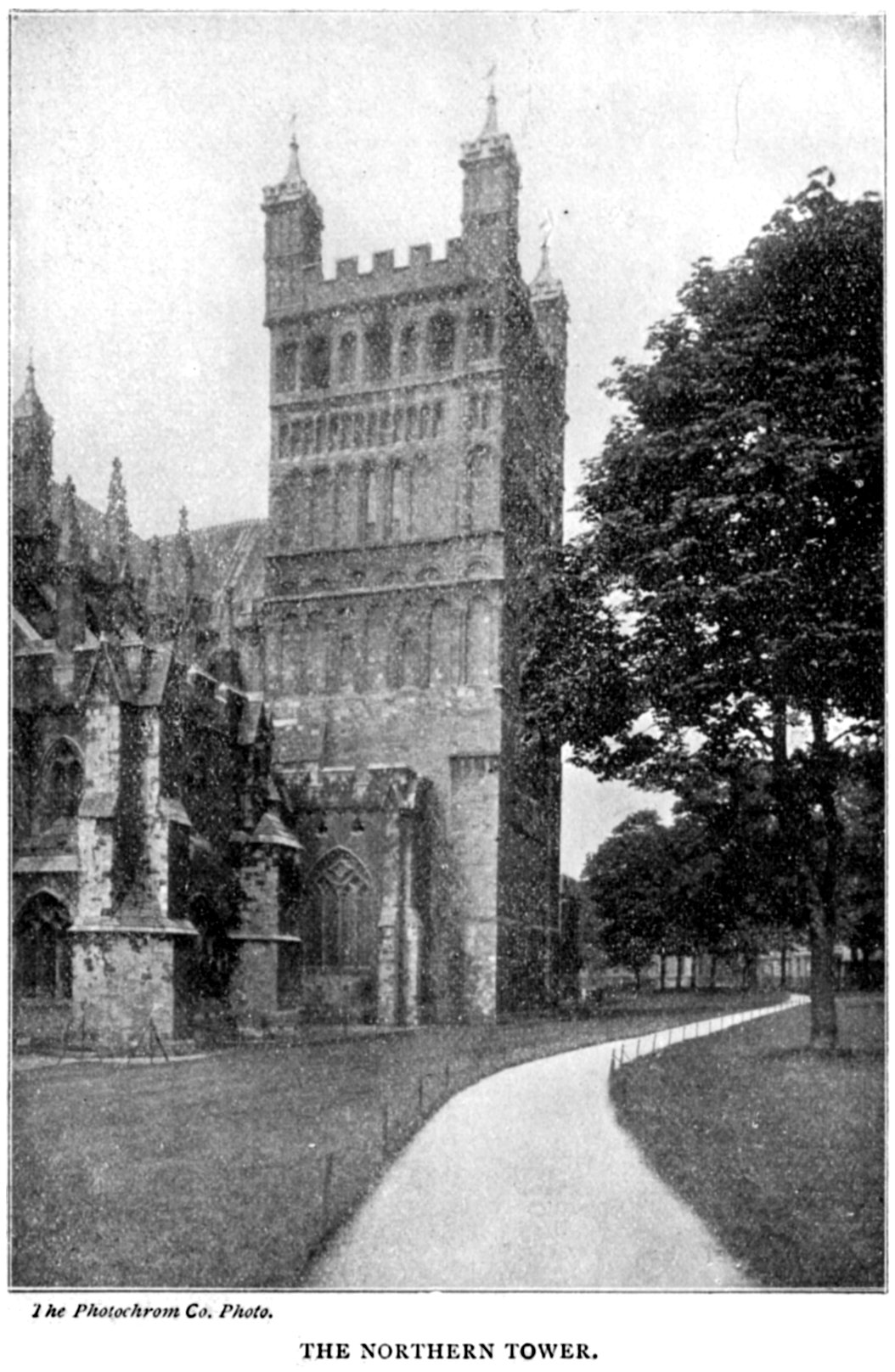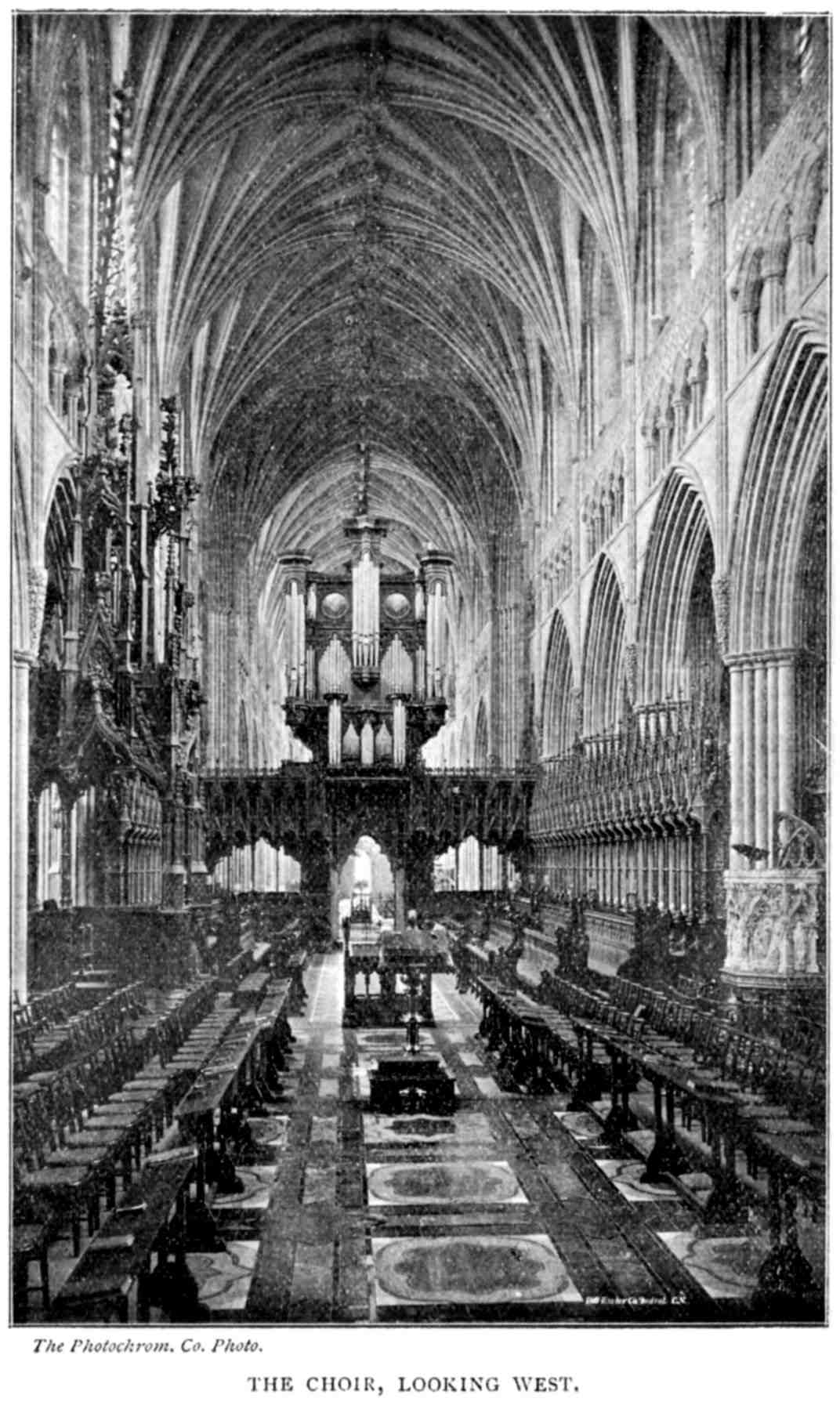 The best views of the building are those to be got from a distance. In some ways this is not without compensation; for the cathedral church was, and is, not only splendid as a building, but the centre of the spiritual life of the diocese. It is, therefore, appropriate that it should seem most beautiful to the dwellers in the villages and hamlets beyond the city, giving them, as it were, a kind of property in the building, which they might not have felt had it been less visible. Nearing Exeter by train, from the Plymouth side, the noble roof and towers are seen above the red houses of the city. The site, indeed, was well chosen. Below the hill on which the city stands are gardens gay with flowers and fair apple orchards. Above, there is a blue sky richer and deeper than is usual in England. On all sides but one stretches the beautiful Devonshire country, meadow, hedgerow, and wooded hill. On that side the Exe flows rapidly, broadening as it goes, towards the sea. Southward but a few miles, the blue channel waters creep up against the yellow sand dunes. No cathedral, not even Lincoln, boasts a more lovely and appropriate position. "In the minds of all early Christians," says Mr. Ruskin, "the church itself was most frequently symbolized under the image of a ship," There is no country so saturated with traditions of the sea as Cornwall and Devon. "Exe terra"—out of the earth—is sometimes declared to be the derivation of the name Exeter. Maybe this was only the grateful jest of some seaman who found himself, after the winter storms, gliding up the quiet river with the city walls rising up before him. Yet the remembrance of such western heroes as Raleigh and Drake, who bade their followers sit well in order, and strike—