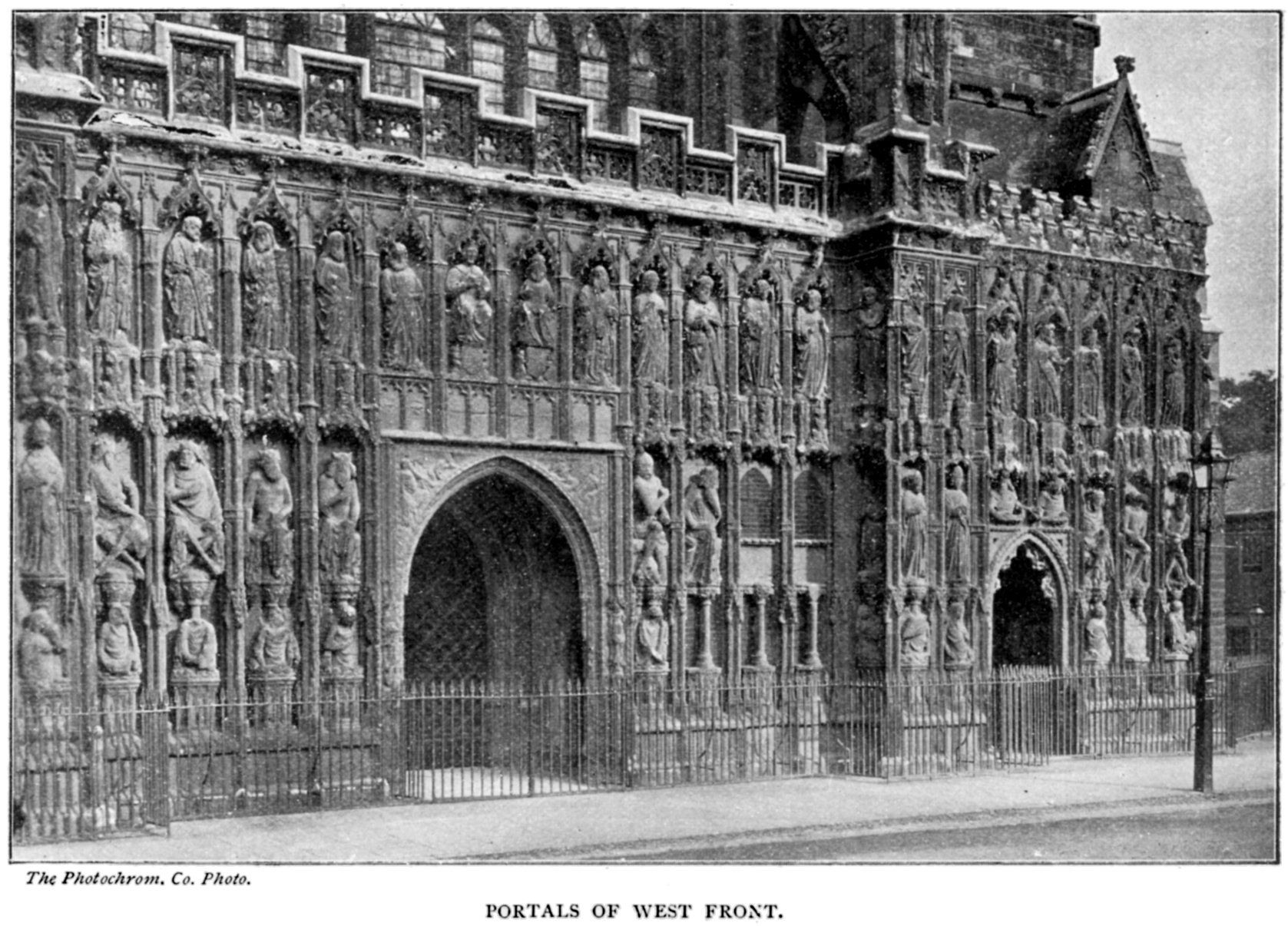 This group of statues has been the subject of a monograph by Miss E.K. Prideaux, who shows that the intention was to symbolize the Heavenly Jerusalem, where angels, saints, and monarchs unite to honour the enthroned Saviour and His Blessed Mother, who, as representative of the Church Triumphant, is [pg 28] being crowned by her Son. The Coronation of the Virgin was depicted in the central group immediately over the great doorway, the figures being those of St. Peter, Our Lady, Our Lord, and St. Paul. At some unknown date the statue of the Virgin was destroyed, and a figure intended to represent Richard II was substituted in 1818. Two other figures, assigned to James the Less and King William I, are modern reproductions by Alfred Stevens; some new heads were also added. Many circumstances have combined with the action of time to injure these sculptures: but the general effect is rich if somewhat heavy. Above the screen is a platform, from which the bishop probably blessed the people, and the minstrels welcomed with song the approach of royal or illustrious visitors.