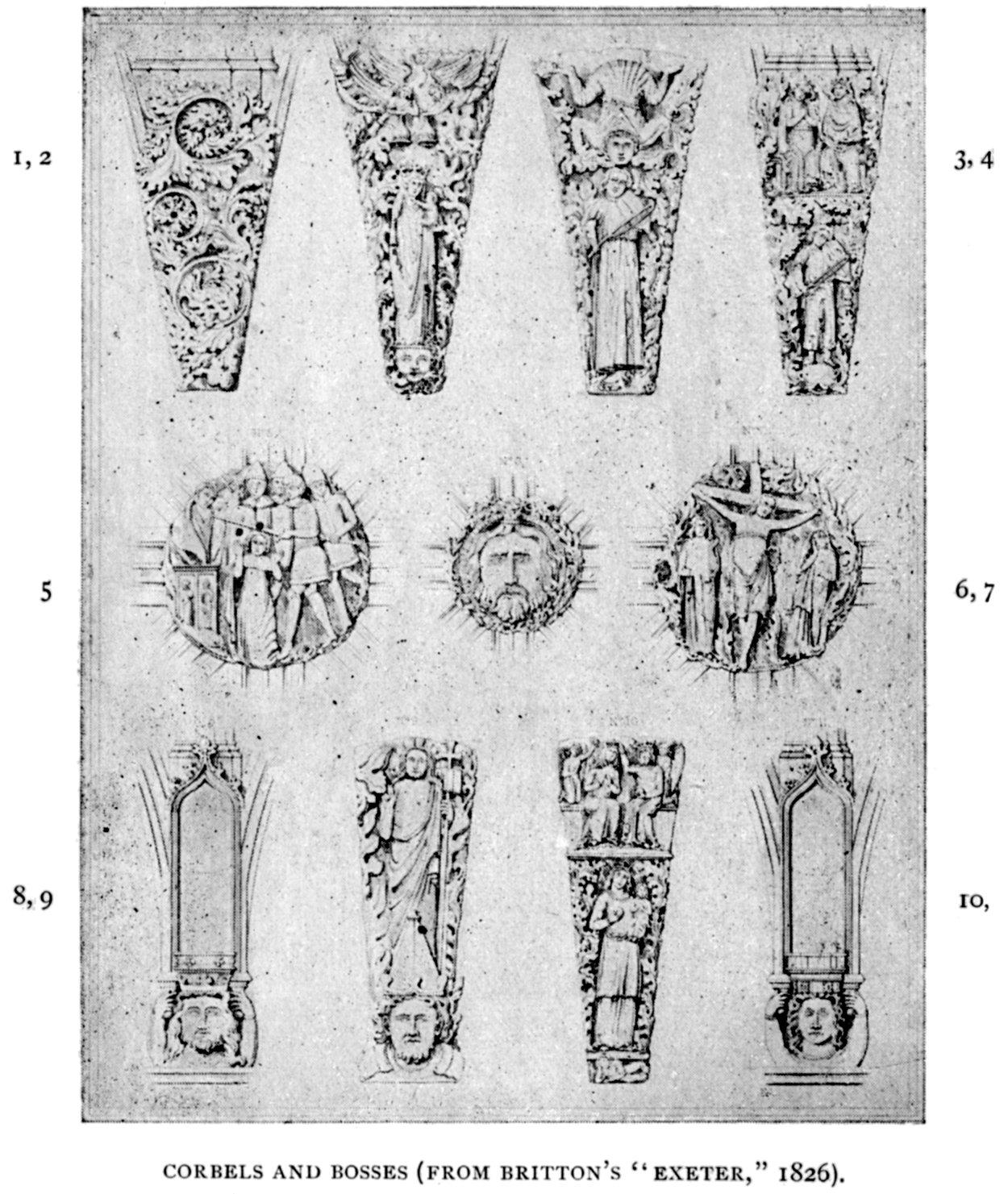 [pg 35] They consist of figures and foliage, and the variety of subjects chosen is no less surprising than the skill the artists have shown in the realization of their ideas. Whether they are peculiar to Exeter or not, it may be safely said that one could not easily find their equals either in design or execution. The subjects treated are too numerous for detailed treatment in this place, but the carving of vines and acorns and oakleaves will be readily admired.