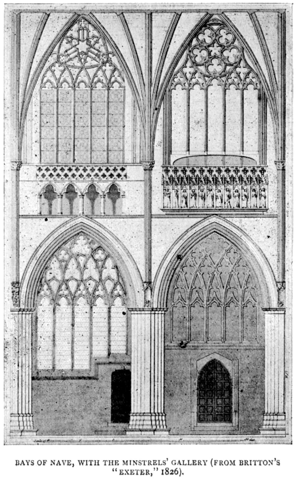 The Minstrels' Gallery.—This is the most beautiful gallery of its kind to be found in England, its twelve decorated niches containing figures of musicians. The musical instruments represented include the cittern, bagpipe, hautboy, crowth, harp, trumpet, organ, guitar, tambour, and cymbals, with two others which are uncertain. The tinted figures of the angels, standing out against an orange-coloured background—each in a separate niche with an elaborately carved canopy—playing upon the various instruments, are admirably carved and most graceful in form and arrangement. The two niches on either side of the gallery contained figures of St. Mary and St. Peter; the niches are supported by corbelled heads of Edward III and Queen Philippa. Edward III created the Black Prince Duke of Cornwall in 1337, and made the city of Exeter part of the duchy. "The city," according to Izacke, "being held of the said duke, as parcel of the dutchy, by the fee farm rent of twenty pounds per ann." To this connexion has been traced the erection of the gallery, for such duchies "were territorial realities," and the prince would be received by minstrels chaunting in the gallery whenever he paid a visit to his feudal dependency. It is asserted that it was first used after the battle of Poictiers, when the Black Prince brought with him to England, visiting Exeter en route for London, the captured French King. But Professor Freeman thinks the Duke did not pay a visit to Exeter at that time, and that local tradition refers really to a later date when "he came home as a sick man" not long before his death.