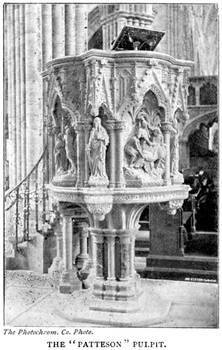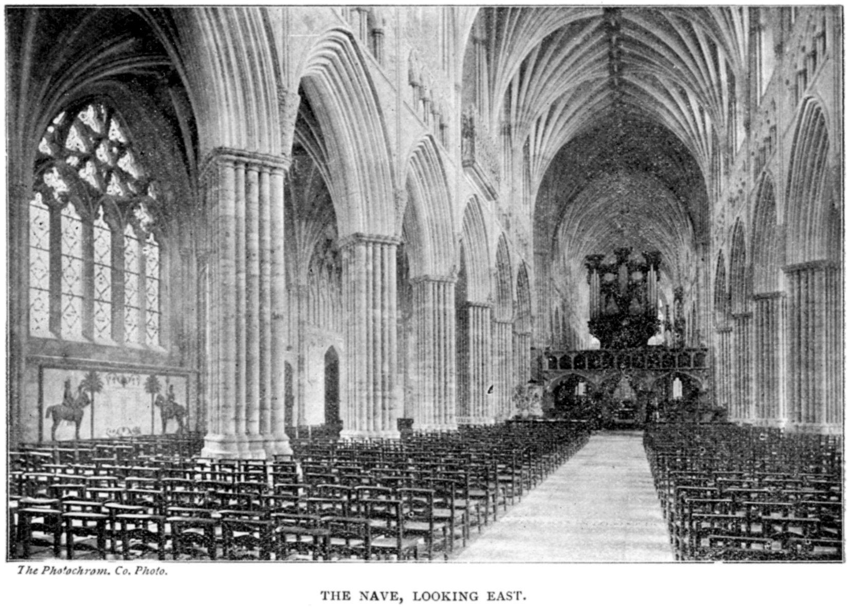 [pg 2] The story of Exeter has an unique interest, and its church, as we shall see, is in many respects without a rival. The fact that a building of such great beauty should adorn a city so situated is remarkable; for long after—as we read in Macaulay—weekly posts left London for various parts of England, Exeter was still, as it were, on the borders of territories scarcely explored, and was the furthest western point to which letters were conveyed from the metropolis. Fuller thus describes the county of Devonshire in his day (1646): "Devonshire hath the narrow seas on the South, the Severn on the North, Cornwall on the West, Dorset and Somersetshire on the East. A goodly province, the second in England for greatness, clear in view without measuring, as bearing a square of fifty miles. Some part thereof, as the South Hams, is so fruitful it needs no art; but generally (though not running of itself) it answers to the spur of industry. No shire showes more industrious, or so many Husbandmen, who by Marle (blew and white), Chalk, Lime, Seasand, Compost, Sopeashes, Rags and what not, make the ground both to take and keep a moderate fruitfulness; so that Virgil, if now alive, might make additions to his Georgicks, from the Plough-practice in this county. As for the natives thereof, generally they are dexterous in any employment, and Queen Elizabeth was wont to say of the gentry: They were all born courtiers with a becomming confidence."