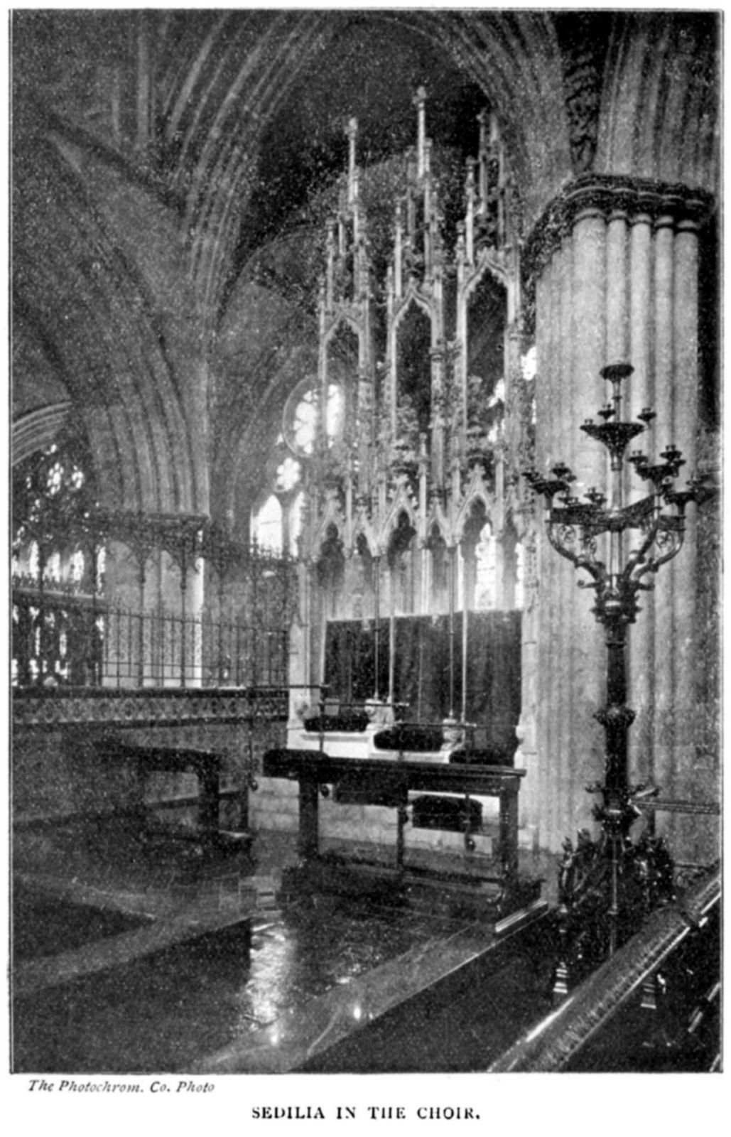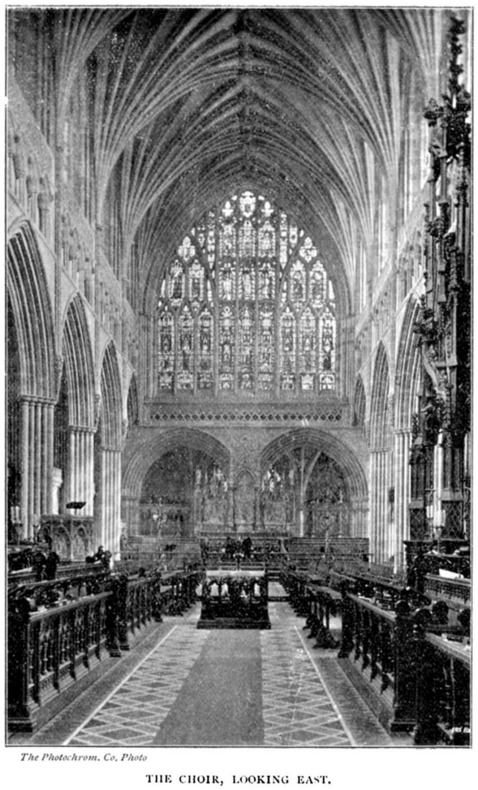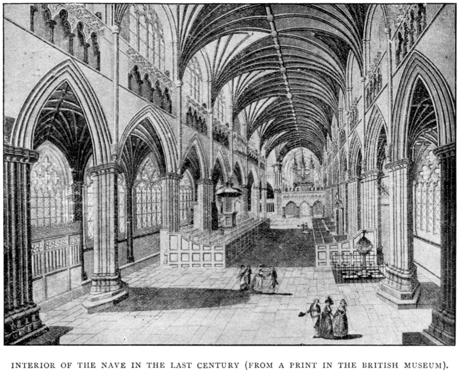 [pg 31] Fine as is the exterior, the interior of the building is quite as beautiful. Restoration of an unusually careful and discreet style has done much to revive the deteriorated splendours of the place. Sixty years ago the nave was filled with hideous and cumbersome pews, and such work as had been done towards keeping the place in repair was in the worst possible taste. But a change has been wrought of the happiest kind in recent years, so that no cathedral in the country can boast a more admirable interior.