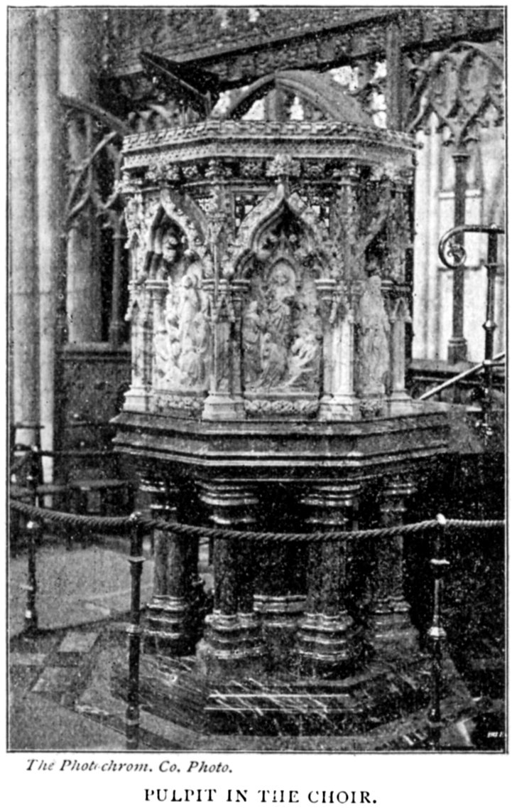 A closer view may seem at first disappointing. Every writer has echoed Dr. Oliver's regret that it should be surrounded "by dwelling-houses of such disparate character." But even a nearer survey is, with patience, rewarded. The towers, exquisitely traceried windows, sculptured doorways, and magnificent roof, easily persuade us to forget its mean surroundings.