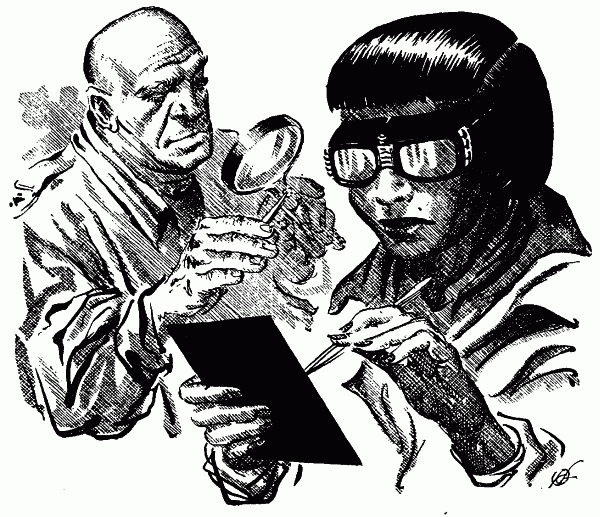 She started to carry the notebooks and sketchbooks over to where Selim von Ohlmhorst was sitting, and then, as she always did, she turned aside and stopped to watch Sachiko. The Japanese girl was restoring what had been a book, fifty thousand years ago; her eyes were masked by a binocular loup, the black headband invisible against her glossy black hair, and she was picking delicately at the crumbled page[Pg 11] with a hair-fine wire set in a handle of copper tubing. Finally, loosening a particle as tiny as a snowflake, she grasped it with tweezers, placed it on the sheet of transparent plastic on which she was reconstructing the page, and set it with a mist of fixative from a little spraygun. It was a sheer joy to watch her; every movement was as graceful and precise as though done to music after being rehearsed a hundred times.