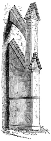 A. The general ground plan of cathedral and conventual churches was after the form of a cross, and the edifice consisted of a central tower, with transepts running north and south; westward of the tower was the nave or main body of the[21] structure, with lateral aisles; and the west front contained the principal entrance, and was often flanked by towers. Eastward of the central tower was the choir, where the principal service was performed, with aisles on each side, and beyond this was the lady chapel. Sometimes the design also comprehended other chapels. On the north or south side was the chapter house, in early times quadrangular, but afterwards octagonal in plan; and on the same side, in most instances, though not always, were the cloisters, which communicated immediately with the church, and surrounded a quadrangular court. The chapter house and cloisters we still find remaining as adjuncts to most cathedral churches, though the conventual buildings of a domestic nature, with which the cloisters formerly also communicated, have generally been destroyed. Mere parochial churches have commonly a tower at the west end, a nave with lateral aisles, and a chancel. Some churches have transepts; and small side chapels or additional aisles have been annexed to many, erected at the costs of individuals, to serve for burial and as chantries. The smallest class of churches have a nave and chancel only, with a small bell-turret formed of wooden shingles, or an open arch of stonework, appearing above the roof at the west end.