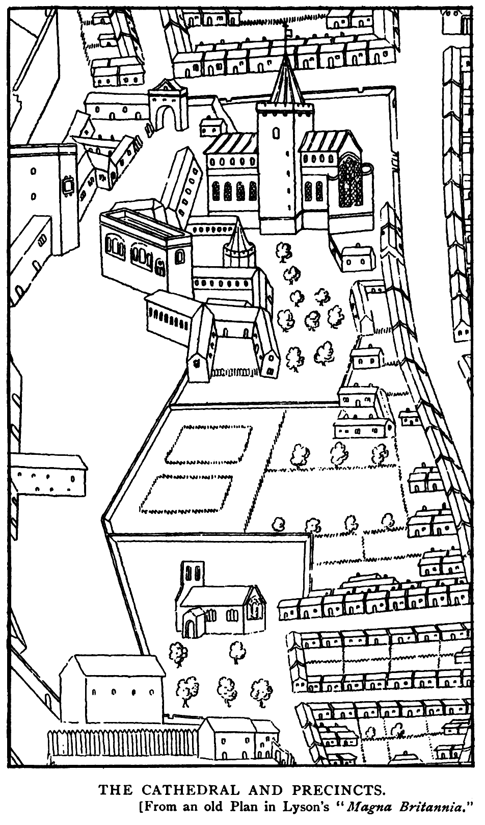 The church was set out, almost due east and west, diagonally across the north-west part of the site, the west end being about 100 feet from the boundary; and was finished about 1130. Its nave consisted of eight bays, and was about 140 feet long.