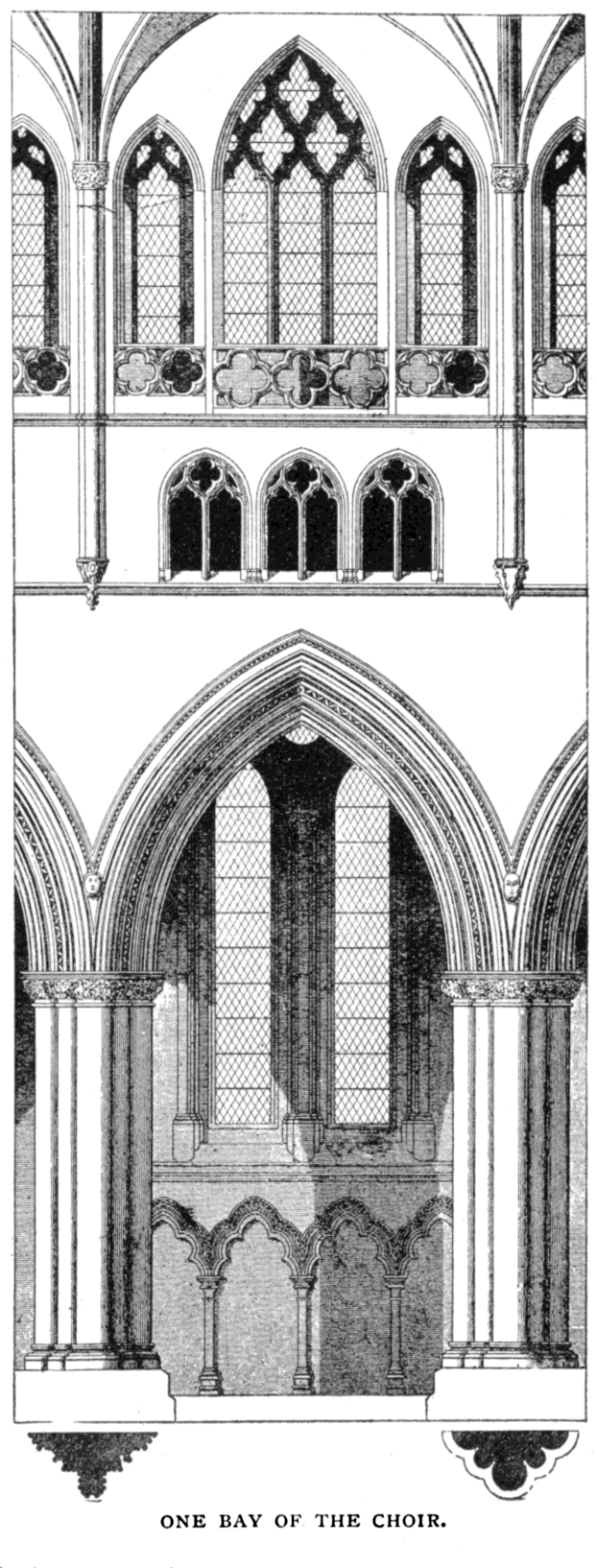 As the choir never had a groined ceiling there was no necessity for flying buttresses, and their absence gives the clerestory a very monotonous flat effect. This is further intensified by the window tracery being level with the wall, the architraves having no depth of moulding round them.