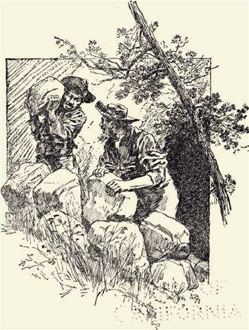 "God guard you, baby," he murmured, as finally he set her down. "Adios, Ned, my lad," and he shook the little man heartily by the hand. "Good luck all! Now I must gallop to make up time." He turned quickly away and went "loping" down the trail, but his gauntlet was drawn across his eyes two or three times before he disappeared from view. Two white little faces gazed wistfully after him and then into each other's eyes. Irish Kate muttered a blessing on the gallant fellow's head. "Come on, Jim," said the captain, with darkening face, and presently the little train was again in motion, winding over the range that, once passed, brings them in view of Snow Lake with the gloomy, jagged rocks bounding the horizon far beyond. There is a deep cleft that one sees in that barrier just as he emerges from the pine woods along the ridge, and that distant cleft is Sunset Pass.