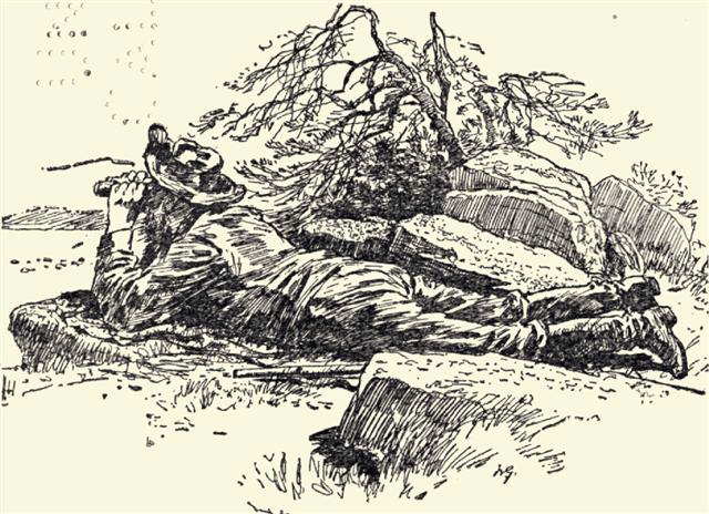 Quickly, crouchingly, he hurried forward some few rods, then knelt so that he might see the coming horseman against the sky. Then challenged sharp and low: