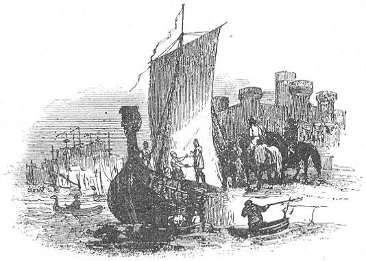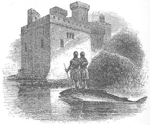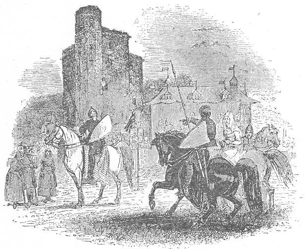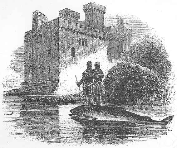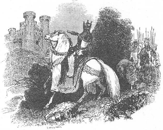 And the road they took was below the palace of Caerlleon, and across the ford of the Usk; and they went along a fair, and even, and lofty ridge of ground, until they came to a town, and at the extremity of the town they saw a Fortress and a Castle. And they came to the extremity of the town. And as the knight passed through it, all the people arose, and saluted him, and bade him welcome. And when Geraint came into the town, he looked at every house, to see if he knew any of those whom he saw. But he knew none, and none knew him to do him the kindness to let him have arms either as a loan or for a pledge. And every house he saw was full of men, and arms, and horses. And they were polishing shields, and burnishing swords, and washing armour, and shoeing horses. And the knight, and the lady, and the dwarf, rode up to the Castle that was in the town, and every one was glad in the Castle. And from the battlements and the gates they risked their necks, through their eagerness to greet them, and to show their joy.