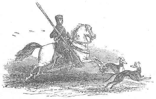 And the youth pricked forth upon a steed with head dappled grey, of four winters old, firm of limb, with shell-formed hoofs, having a bridle of linked gold on his head, and upon him a saddle of costly gold. And in the youth’s hand were two spears of silver, sharp, well-tempered, headed with steel, three ells in length, of an edge to wound the wind, and cause blood to flow, and swifter than the fall [66] of the dew-drop from the blade of reed grass upon the earth, when the dew of June is at the heaviest. A gold-hilted sword was upon his thigh, the blade of which was of gold, bearing a cross of inlaid gold of the hue of the lightning of heaven: his war-horn was of ivory. Before him were two brindled white-breasted greyhounds, having strong collars of rubies about their necks, reaching from the shoulder to the ear. And the one p. 67that was on the left side bounded across to the right side, and the one on the right to the left, and like two sea swallows sported around him. And his courser cast up four sods with his four hoofs, like four swallows in the air, about his head, now above, now below. About him was a four-cornered cloth of purple, and an apple of gold was at each corner; and every one of the apples was of the value of an hundred kine. And there was precious gold of the value of three hundred kine upon his shoes, and upon his stirrups, from his knee to the tip of his toe. And the blade of grass bent not beneath him, so light was his courser’s tread as he journeyed towards the gate of Arthur’s palace.