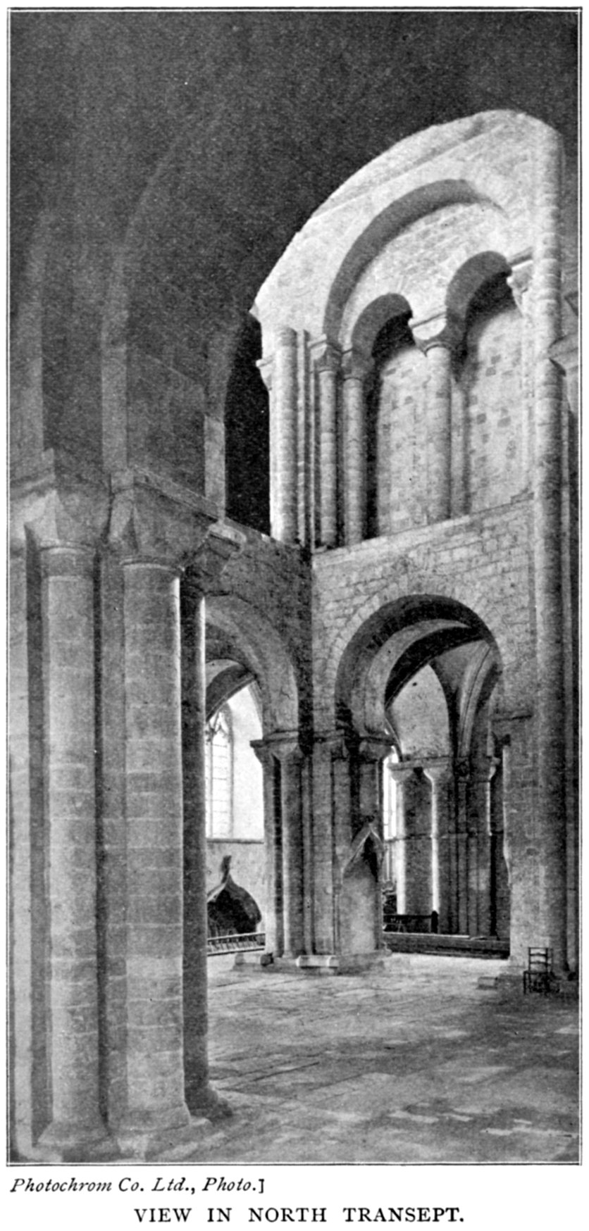 It has been mentioned that when the tower was rebuilt the columns nearest it in the transepts were strengthened. They now, indeed, present a singularly massive outline to the eye, and contrast strongly even with the remaining Norman pillars in the transepts. The arches also are changed. All were once semi-circular, but the rebuilding necessitated a change of the first and second from the actual tower-pier into the stilted or "horse-shoe" form. They are doubly recessed (except those supporting the end platform, which have but one soffit), and present quite plain and unadorned square edges.63