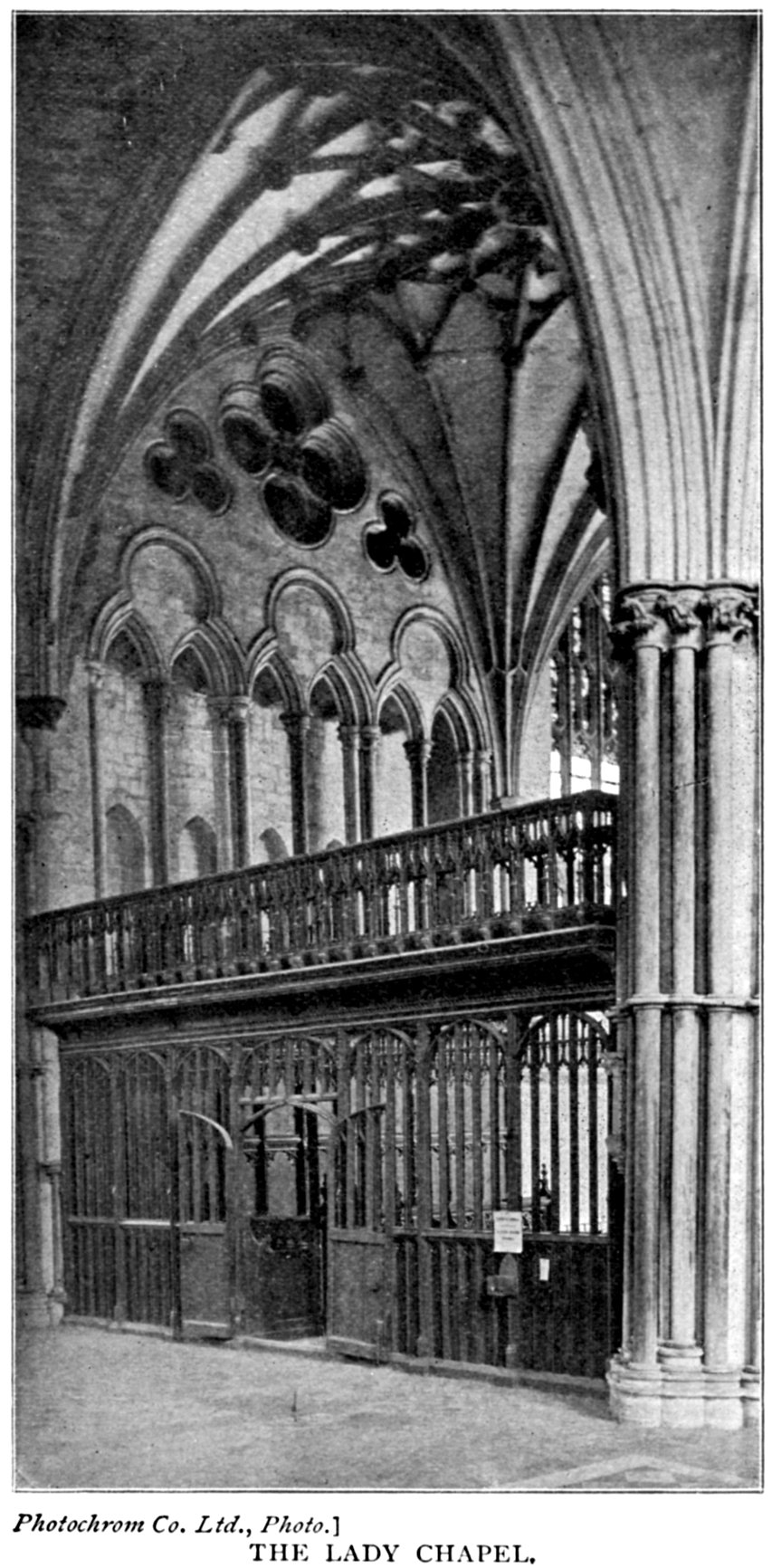 The Lady Chapel has at the end and at each side a fine seven-light Perpendicular window, the heads of the lights below the transom being cinquefoiled, while above each window is a cornice supported by small arches resting on corbels; over all is a pierced battlement, which is also crenelated at the actual east end. Below the east window of the Lady Chapel, between the two great buttresses with mutilated canopies on the two lower of their three divisions, there is some blank panelling, consisting of four shallow-arched recesses with a pilaster down the centre, each arch uniting two minor ones with cinquefoil cusps at the head and crowned by a quatrefoil with a rosette in the middle. There were originally four heads at the ends of the corbels under these quatrefoils, but the southernmost is broken away. A similar arcade runs along the southern wall of the Lady Chapel, but there is none on the north side. The two main corbel-tables at the east end show the arms of England and France and the bishop's device of three "torteaux." Under these, at a short distance from the ground, are two smaller windows, which give light to the Lady Chapel crypt. The panelling dates from about 1490, and is due to Bishop Peter Courtenay.31