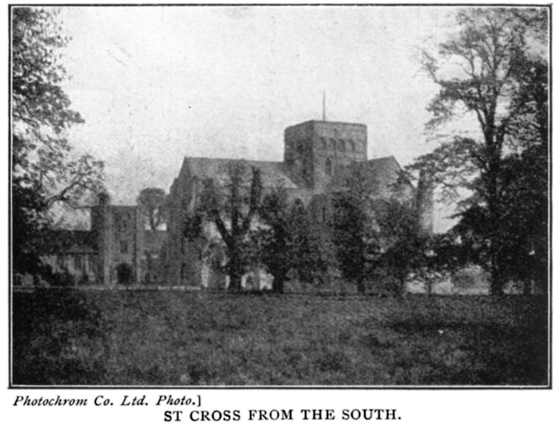 In the south wall of the cathedral, close to the west front, there is a doorway which is reported to have led to the chapel and charnel-house mentioned by Leland. "S. Swithin, now called Trinity," he says, "stands on the south side of the town, and there is a chapelle with a carnarie at the west end of it." S. Swithin is, of course, the cathedral itself. Leland's other carnary, which must not be confused with this, was attached to a chapel "on the north side of S. Mary Abbey church at Winchester, in an area thereby, on which men entre by a certen steppes. One Inkepenne, a gentilman that berith in his shield a scheker sylver and sables, was founder of it. There be three tumbes of marble of prestes custodes of the chapelle."