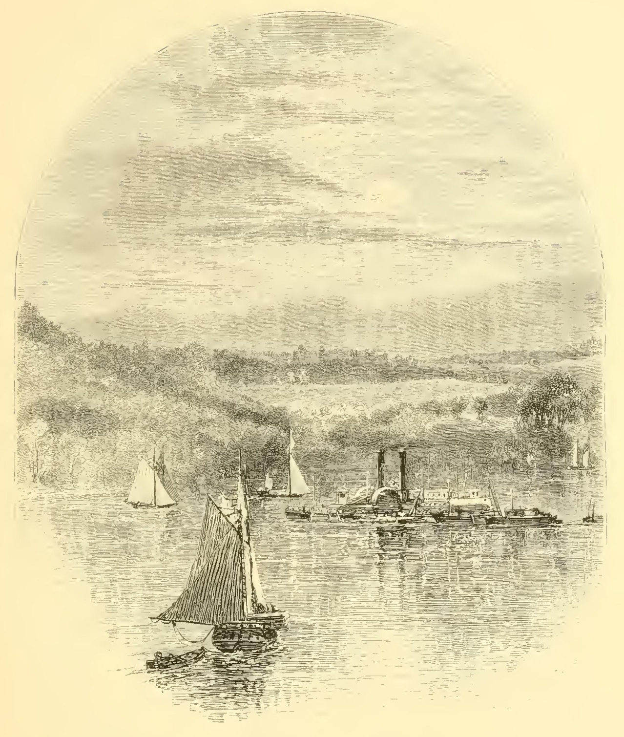 Thus feeding his mind with many sweet thoughts and “sugared suppositions,” he journeyed along the sides of a range of hills which look out upon some of the goodliest scenes of the mighty Hudson. The sun gradually wheeled his broad disk down into the west. The wide bosom of the Tappan Zee lay motionless and glassy, excepting that here and there a gentle undulation waved and prolonged the blue shadow of the distant mountain. A few amber clouds floated in the sky, without a breath of air to move them. The horizon was of a fine golden tint, changing gradually into a pure apple green, and from that into the deep blue of the mid-heaven. A slanting ray lingered on the woody crests of the precipices that overhung some parts of the river, giving greater depth to the dark-gray and purple of their rocky sides. A sloop was loitering in the distance, dropping slowly down with the tide, her sail hanging uselessly against the mast, and as the reflection of the sky gleamed along the still water it seemed as if the vessel was suspended in the air.
