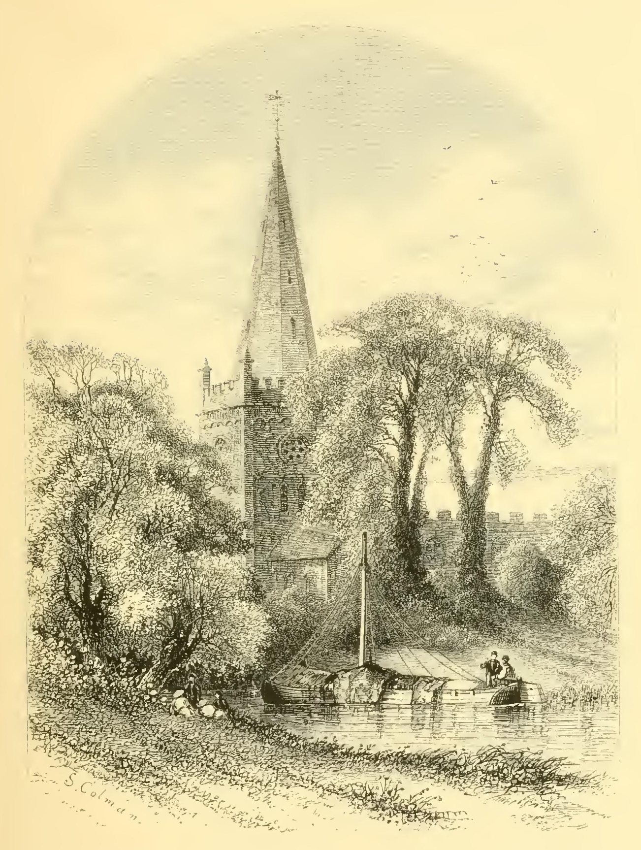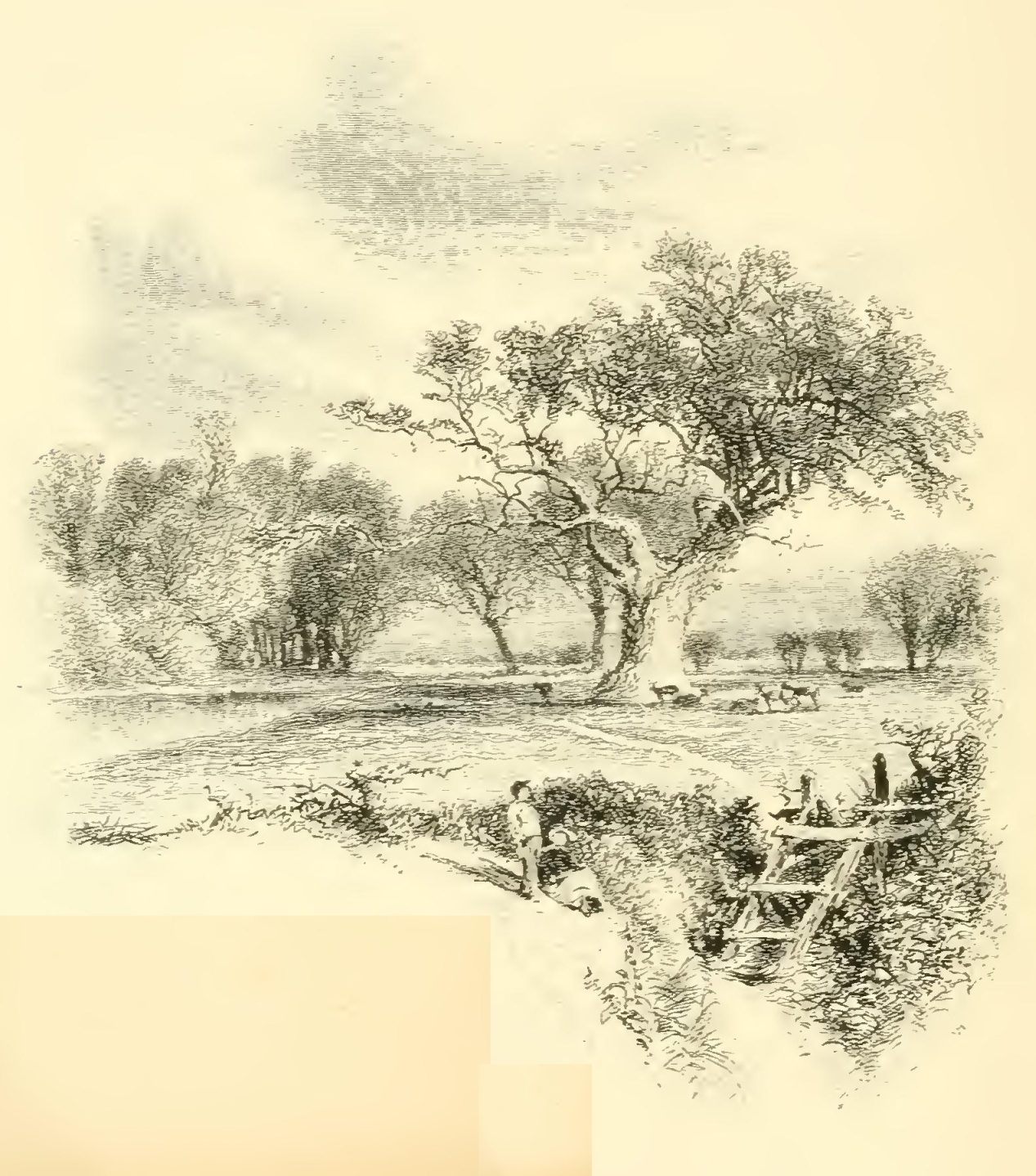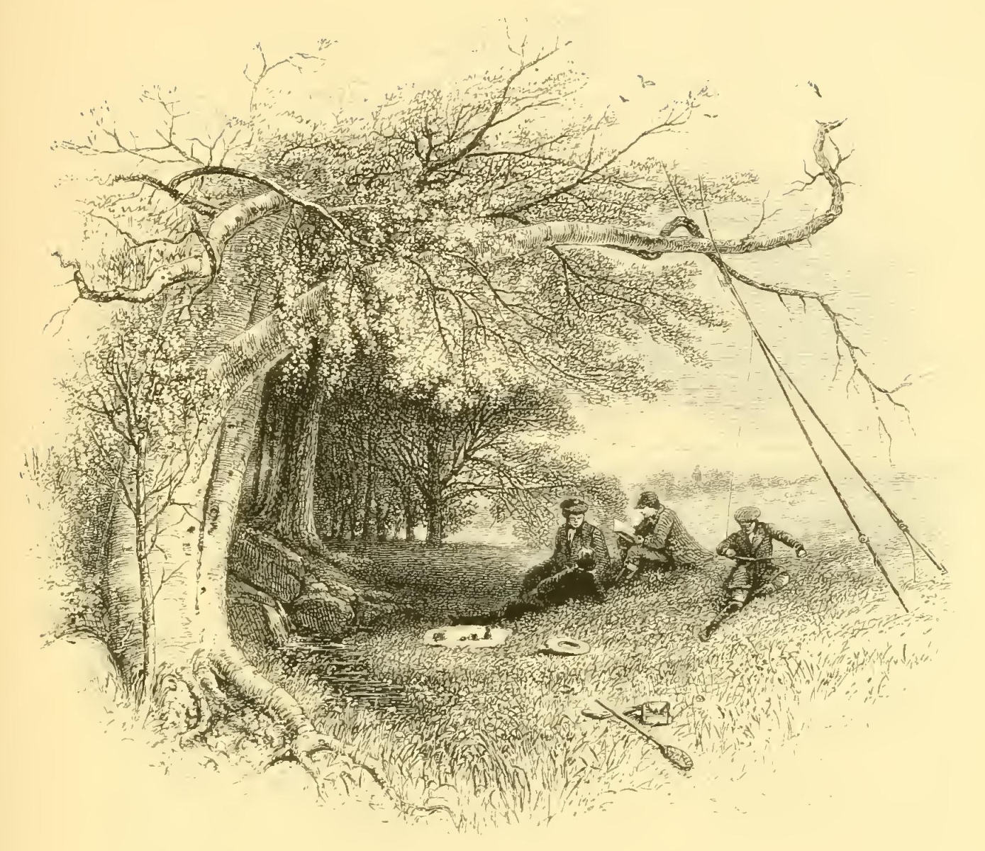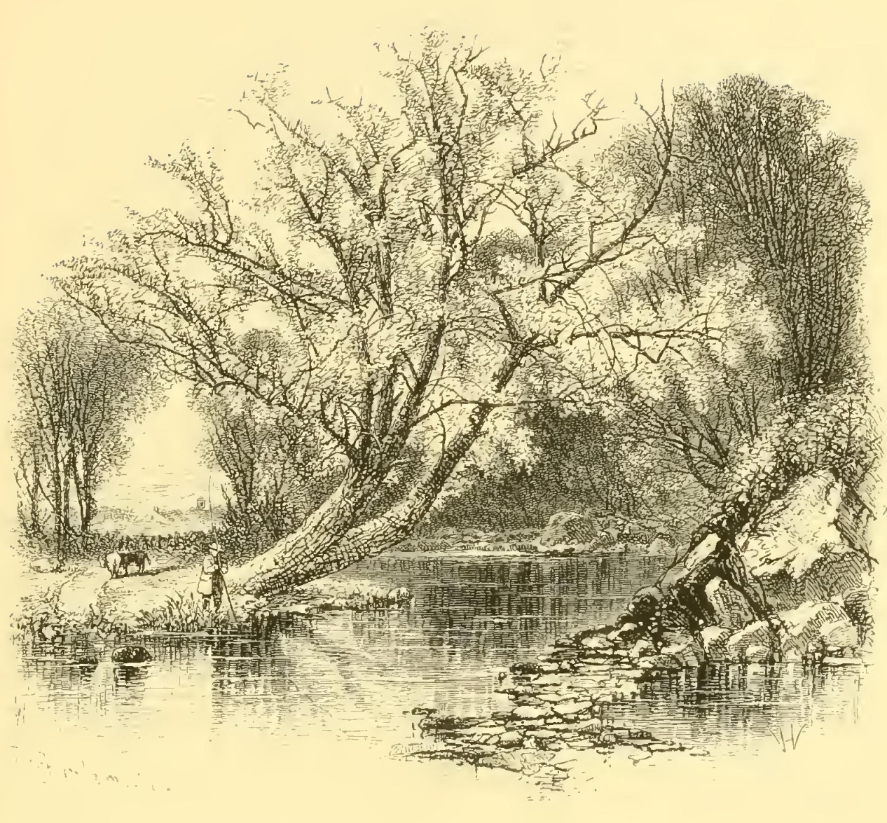 There is certainly something in angling—if we could forget, which anglers are apt to do, the cruelties and tortures inflicted on worms and insects—that tends to produce a gentleness of spirit and a pure serenity of mind. As the English are methodical even in their recreations, and are the most scientific of sportsmen, it has been reduced among them to perfect rule and system. Indeed, it is an amusement peculiarly adapted to the mild and highly-cultivated scenery of England, where every roughness has been softened away from the landscape. It is delightful to saunter along those limpid streams which wander, like veins of silver, through the bosom of this beautiful country, leading one through a diversity of small home scenery—sometimes winding through ornamented grounds; sometimes brimming along through rich pasturage, where the fresh green is mingled with sweet-smelling flowers; sometimes venturing in sight of villages and hamlets, and then running capriciously away into shady retirements. The sweetness and serenity of Nature and the quiet watchfulness of the sport gradually bring on pleasant fits of musing, which are now and then agreeably interrupted by the song of a bird, the distant whistle of the peasant, or perhaps the vagary of some fish leaping out of the still water and skimming transiently about its glassy surface. “When I would beget content,” says Izaak Walton, “and increase confidence in the power and wisdom and providence of Almighty God, I will walk the meadows by some gliding stream, and there contemplate the lilies that take no care, and those very many other little living creatures that are not only created, but fed (man knows not how) by the goodness of the God of Nature, and therefore trust in Him.”