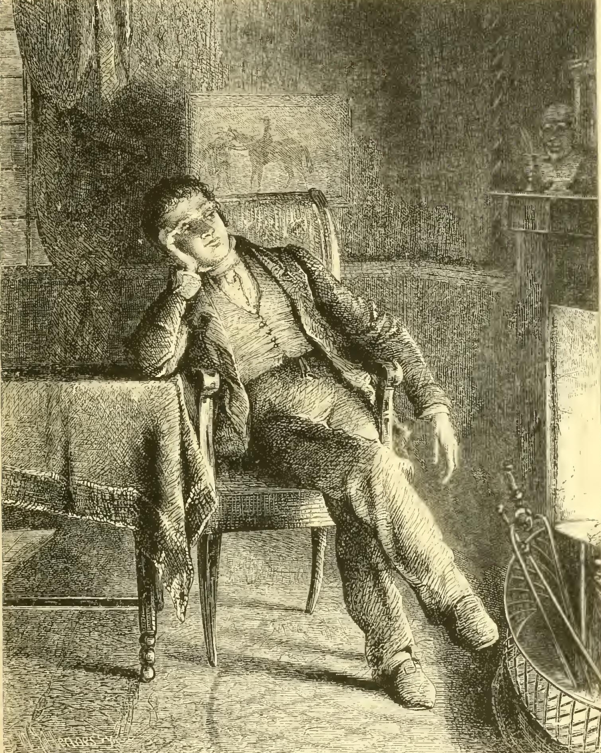 Some days afterwards, he called upon me in the evening. He had disposed of his dwelling-house, and taken a small cottage in the country, a few miles from town. He had been busied all day in sending out furniture. The new establishment required few articles, and those of the simplest kind. All the splendid furniture of his late residence had been sold, excepting his wife’s harp. That, he said, was too closely associated with the idea of herself it belonged to the little story of their loves; for some of the sweetest moments of their courtship were those when he had leaned over that instrument, and listened to the melting tones of her voice.—I could not but smile at this instance of romantic gallantry in a doating husband.