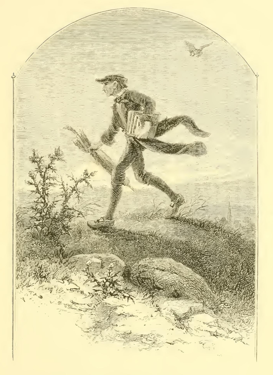 In this by-place of Nature there abode, in a remote period of American history—that is to say, some thirty years since—a worthy wight of the name of Ichabod Crane, who sojourned, or, as he expressed it, “tarried,” in Sleepy Hollow for the purpose of instructing the children of the vicinity. He was a native of Connecticut, a State which supplies the Union with pioneers for the mind as well as for the forest, and sends forth yearly its legions of frontier woodmen and country schoolmasters. The cognomen of Crane was not inapplicable to his person. He was tall, but exceedingly lank, with narrow shoulders, long arms and legs, hands that dangled a mile out of his sleeves, feet that might have served for shovels, and his whole frame most loosely hung together. His head was small, and flat at top, with huge ears, large green glassy eyes, and a long snip nose, so that it looked like a weathercock perched upon his spindle neck to tell which way the wind blew. To see him striding along the profile of a hill on a windy day, with his clothes bagging and fluttering about him, one might have mistaken him for the genius of Famine descending upon the earth or some scarecrow eloped from a cornfield.