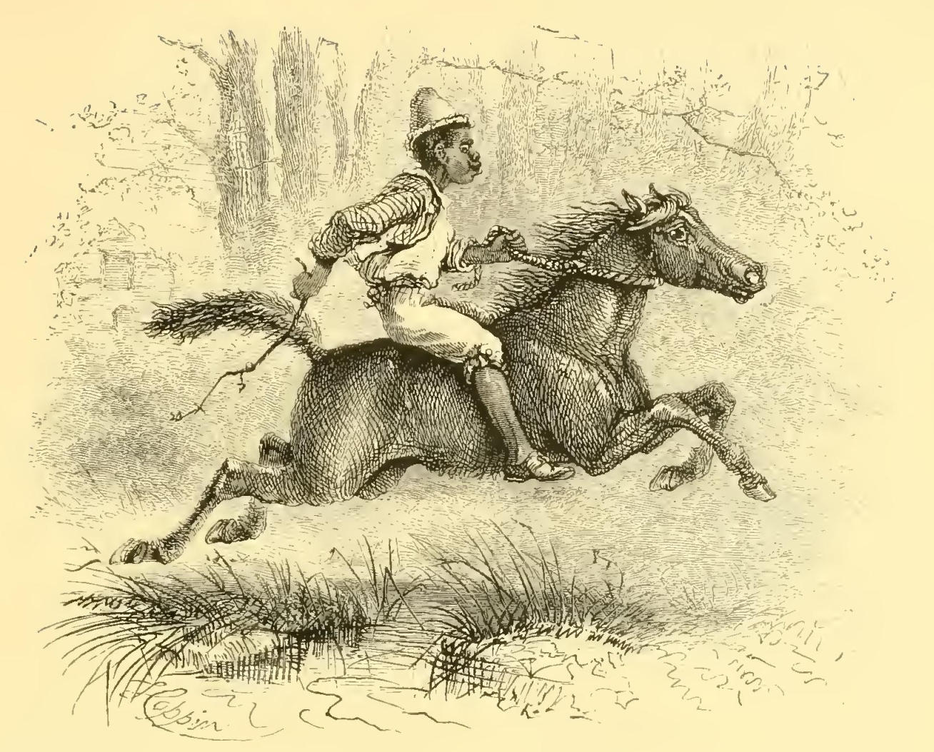 Ichabod was a suitable figure for such a steed. He rode with short stirrups, which brought his knees nearly up to the pommel of the saddle; his sharp elbows stuck out like grasshoppers’; he carried his whip perpendicularly in his hand like a sceptre; and as his horse jogged on the motion of his arms was not unlike the flapping of a pair of wings. A small wool hat rested on the top of his nose, for so his scanty strip of forehead might be called, and the skirts of his black coat fluttered out almost to his horse’s tail. Such was the appearance of Ichabod and his steed as they shambled out of the gate of Hans Van Ripper, and it was altogether such an apparition as is seldom to be met with in broad daylight.