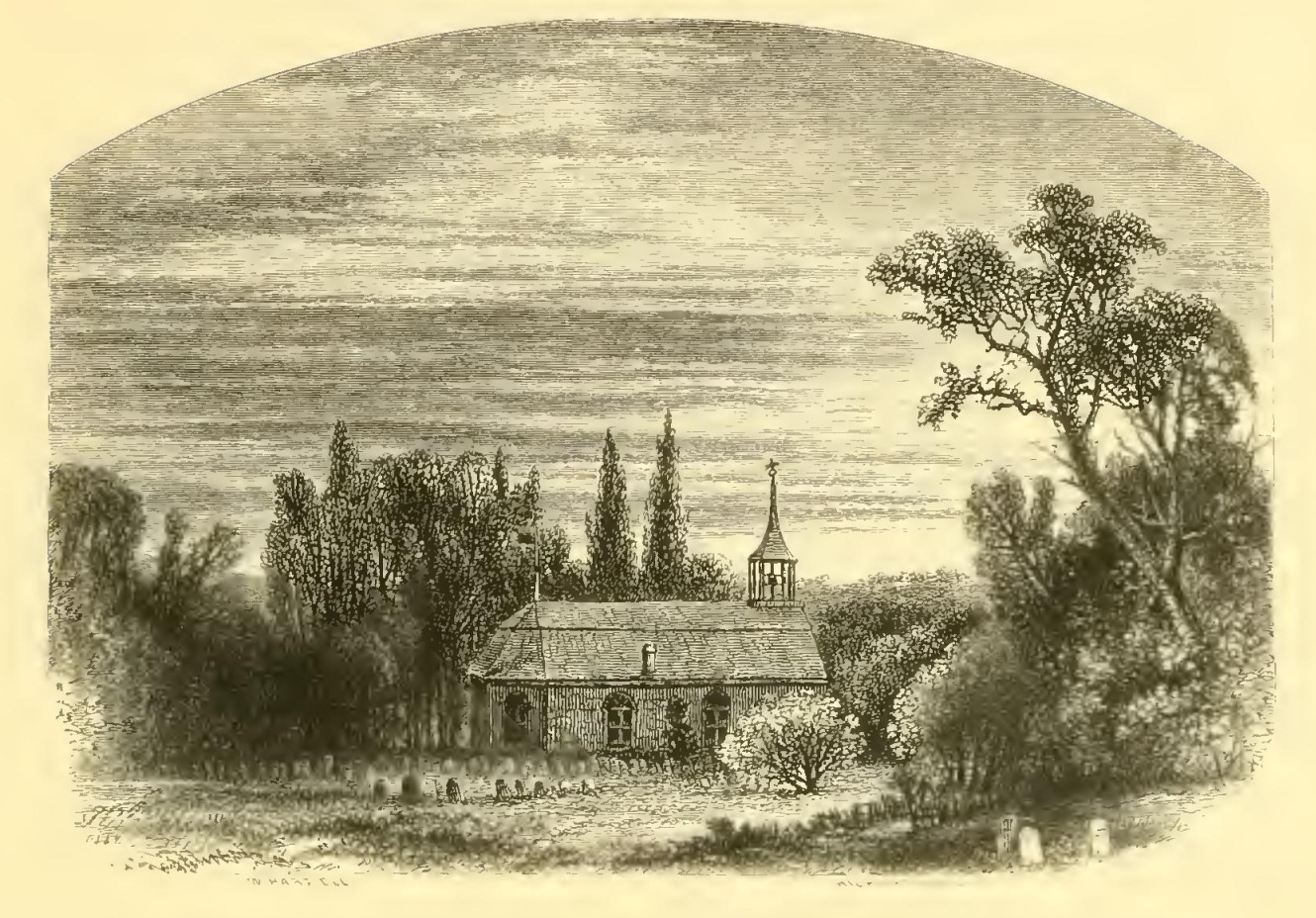 The sequestered situation of this church seems always to have made it a favorite haunt of troubled spirits. It stands on a knoll surrounded by locust trees and lofty elms, from among which its decent whitewashed walls shine modestly forth, like Christian purity beaming through the shades of retirement. A gentle slope descends from it to a silver sheet of water bordered by high trees, between which peeps may be caught at the blue hills of the Hudson. To look upon its grass-grown yard, where the sunbeams seem to sleep so quietly, one would think that there at least the dead might rest in peace. On one side of the church extends a wide woody dell, along, which raves a large brook among broken rocks and trunks of fallen trees. Over a deep black part of the stream, not far from the church, was formerly thrown a wooden bridge; the road that led to it and the bridge itself were thickly shaded by overhanging trees, which cast a gloom about it even in the daytime, but occasioned a fearful darkness at night. Such was one of the favorite haunts of the headless horseman, and the place where he was most frequently encountered. The tale was told of old Brouwer, a most heretical disbeliever in ghosts, how he met the horseman returning from his foray into Sleepy Hollow, and was obliged to get up behind him; how they galloped over bush and brake, over hill and swamp, until they reached the bridge, when the horseman suddenly turned into a skeleton, threw old Brouwer into the brook, and sprang away over the tree-tops with a clap of thunder.