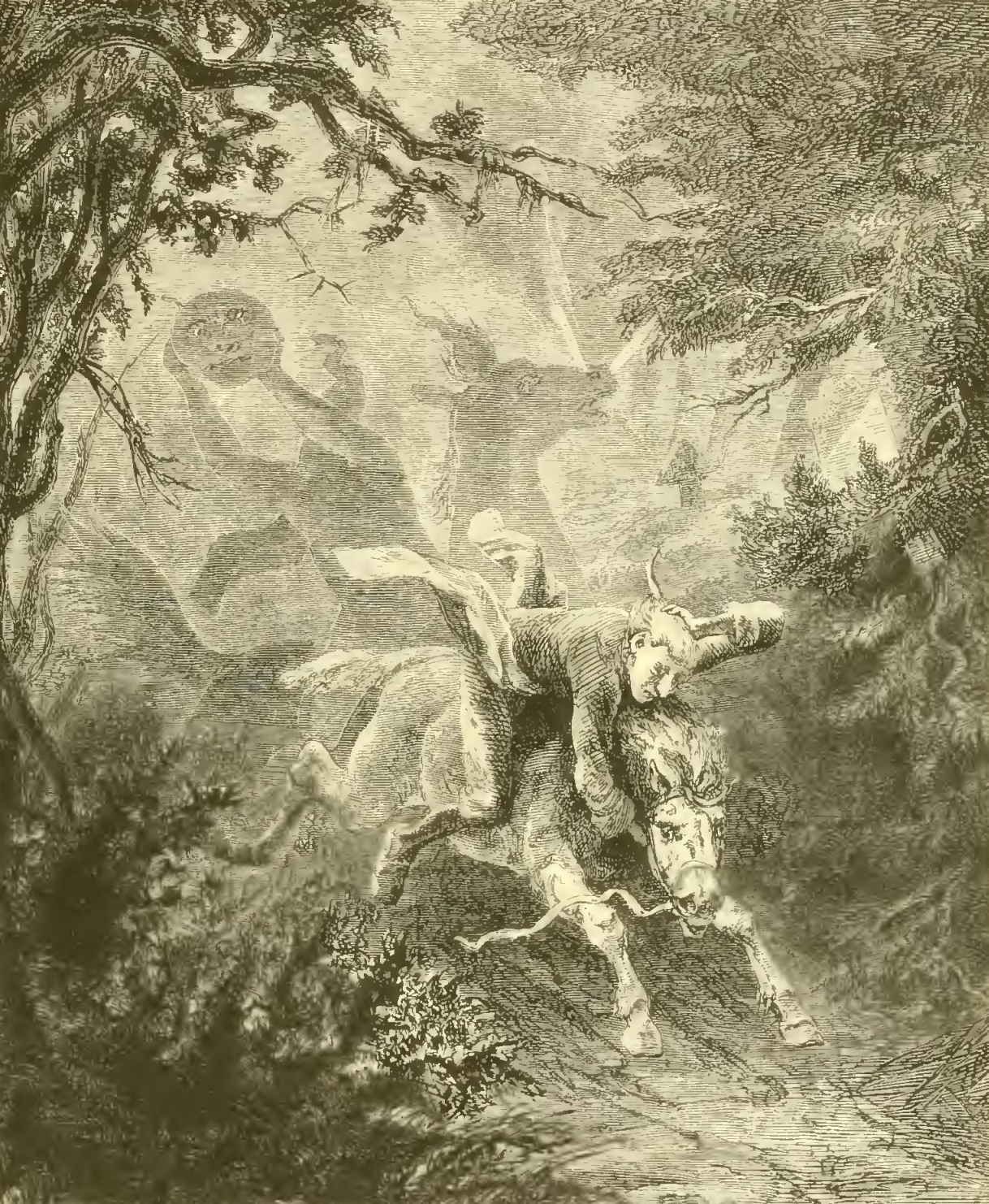 Ichabod, who had no relish for this strange midnight companion, and bethought himself of the adventure of Brom Bones with the Galloping Hessian, now quickened his steed in hopes of leaving him behind. The stranger, however, quickened his horse to an equal pace. Ichabod pulled up, and fell into a walk, thinking to lag behind; the other did the same. His heart began to sink within him; he endeavored to resume his psalm tune, but his parched tongue clove to the roof of his mouth and he could not utter a stave. There was something in the moody and dogged silence of this pertinacious companion that was mysterious and appalling. It was soon fearfully accounted for. On mounting a rising ground, which brought the figure of his fellow-traveller in relief against the sky, gigantic in height and muffled in a cloak, Ichabod was horror-struck on perceiving that he was headless! but his horror was still more increased on observing that the head, which should have rested on his shoulders, was carried before him on the pommel of the saddle. His terror rose to desperation, he rained a shower of kicks and blows upon Gunpowder, hoping by a sudden movement to give his companion the slip; but the spectre started full jump with him. Away, then, they dashed through thick and thin, stones flying and sparks flashing at every bound. Ichabod’s flimsy garments fluttered in the air as he stretched his long lank body away over his horse’s head in the eagerness of his flight.