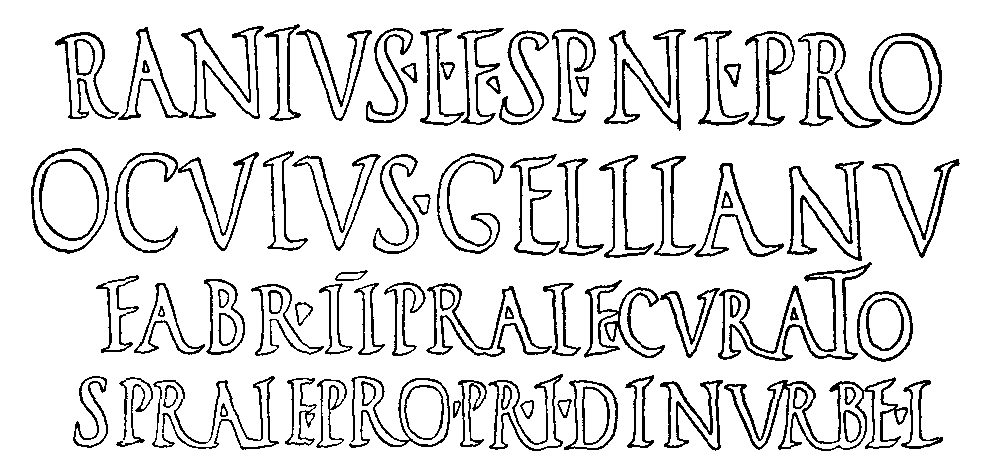 12 "Rustic" Roman Capitals. Of pen forms, but cut in stone. Redrawn from a rubbing. From fragment in the National Museum, Naples. F. C. B.