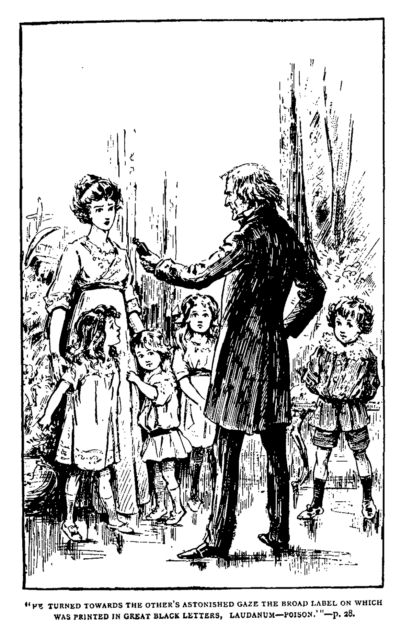 Six o’clock.—Both drawing-rooms at “The Firs” were thrown into one, and brilliantly lighted up. Mysterious sounds in the dining-room below told of preparations for that part of the evening’s proceedings, by no means the least gratifying to the members of a juvenile party. Friends began to assemble: young boys and girls in shoals, the former dazzling in neckties and pins, the latter in brooches and earrings: with a sprinkling of seniors. The host, hostess, and her daughters were all smiles; the last-named especially, unable, indeed, to give expression to their satisfaction at having the happiness of receiving their dear young friends. Mark was there, of course, full of fun, and really enjoying himself, the life and soul of everything.