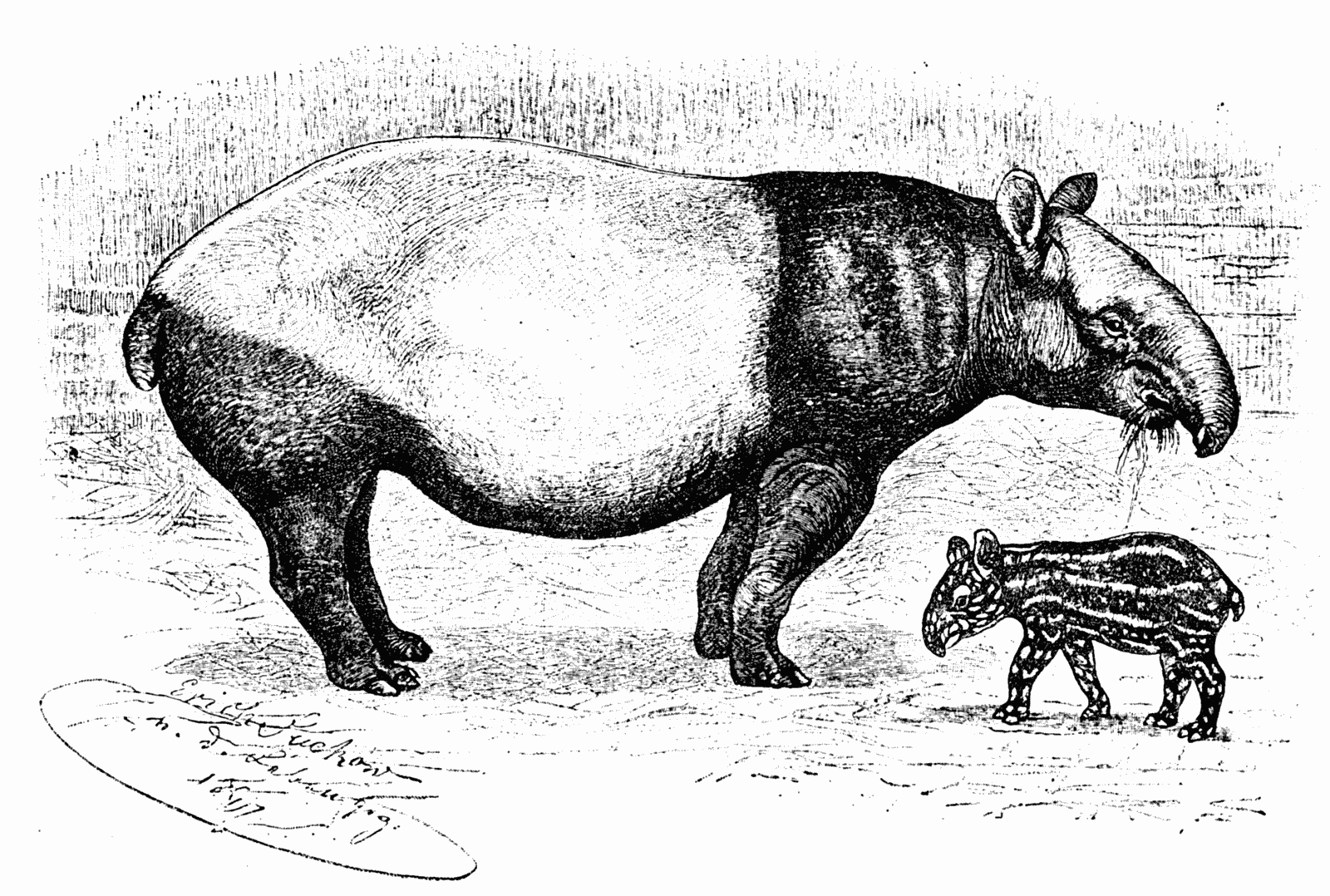 A fine pair of shabrack (Tapirus indicus) and another pair of American tapirs (Tapirus americanus) constitute the chief attraction of the house devoted to pachyderms in the Zoological Garden at Breslau, and interest in this section of the garden has recently been greatly enhanced by the appearance of a healthy young shabrack. This is only the second time that a shabrack tapir has been born in captivity in Europe, and as the other one, which was born in the Zoological Garden at Hamburg, did not live many days, but few knew of its existence; consequently, little or nothing is known of the care and development of the young of this species, although they are so numerous in their native lands. Farther India, Southwestern China and the neighboring large islands, where they also do well in captivity. The tapir was not known until the beginning of this century, and even now it is a great rarity in the European animal market, and as the greatest care is required to keep it alive for any length of time in captivity, it is seldom seen in zoological gardens; therefore, the fact that the shabrack tapirs in the Breslau garden have not only lived, but their number has increased, is so much more remarkable.
