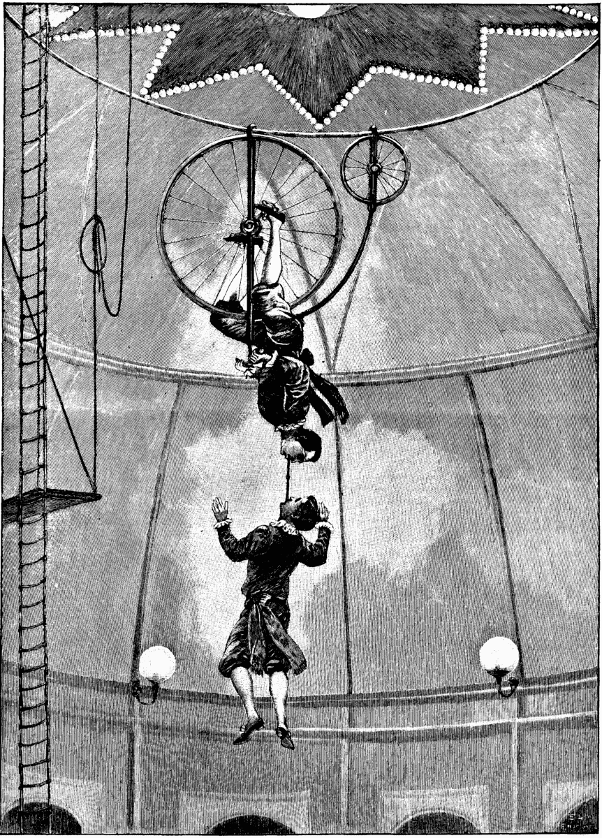 "Artists" of the variety stage and the circus are always trying to find something new, for the same old trapeze performances, trials of strength, performances of rope dancers, etc., have been presented so many times that anyone who invents an entirely new trick is sure of making a large amount of money out of it; the more wild and dangerous it is, the better. Anything that naturally stands on its feet but can be made to stand on its head will be well received in the latter attitude by the public. Some such thought as this must have been in the mind of the man who conceived the idea of riding a bicycle on the ceiling instead of on the floor. The "trick" originated with the Swiss acrobat Di Batta, who, being too old to undertake such a performance himself, trained two of his pupils to do it, and they appeared with their wheel in Busch Circus in Berlin. The wheel, of course, ran on a track from which it was suspended in such a way that it could not fall, and the man who operated it used the handle bar as he would the cross bar of the trapeze. One would think that the position of the rider was sufficiently dangerous to satisfy any public, but the inventor of the trick sought to make it appear more wonderful by having the rider carry between his teeth a little trapeze from the crosspiece of which another man hung.