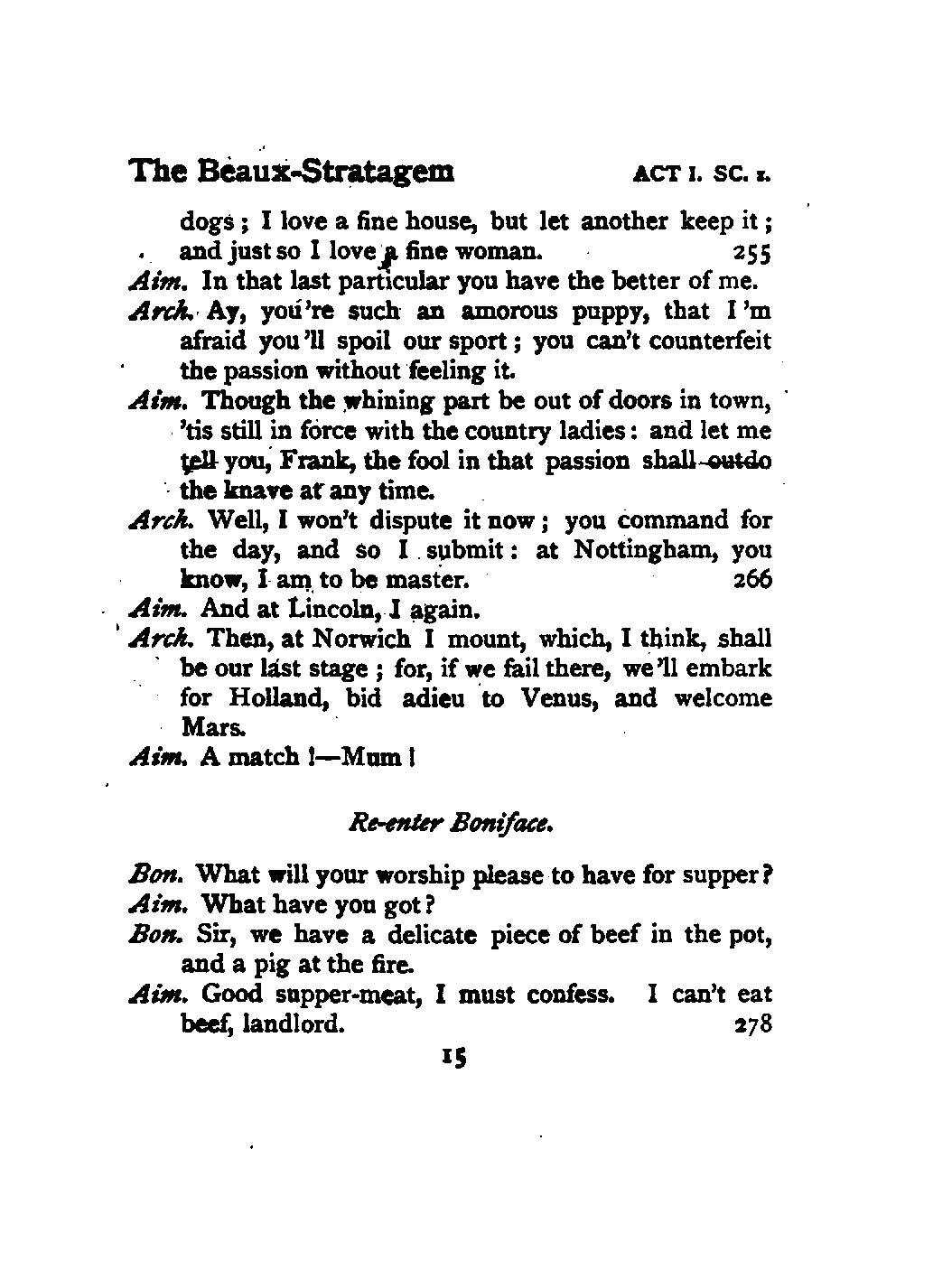 The First Performance. The Beaux-Stratagem was first performed on Saturday, 8th March 1707, at the Theatre Royal (or, as it was sometimes called, the Queen's Theatre), situated in the Haymarket, on the site afterwards occupied by Her Majesty's Theatre. It ran for ten nights only, owing to benefits. The cast on that occasion was a strong one. Robert Wilks (a brother-Irishman), who performed Archer, was the foremost actor of the day. He was Farquhar's lifelong friend, and appeared in all his plays, except Love and a Bottle which was produced in London during Wilks's absence in Dublin. This actor's most famous part was 'Sir Harry Wildair' (The Constant Couple), which our author drew on purpose for him, and which ran for fifty-two nights on its first appearance. Farquhar himself said that when the stage had the misfortune to lose Wilks, 'Sir Harry Wildair' might go to the Jubilee! Peg Woffington is said to have been his only rival in this part. Sullen was the last original character undertaken by Verbruggen, a leading actor of the time. It was from Verbruggen's wife (probably the 'Mrs. V———' of Farquhar's letters) that the famous Mrs. Oldfield received her earliest instructions in acting. The last-named lady was the original Mrs. Sullen. Her connection [xii]with Farquhar is very interesting and romantic. She resided with her aunt, Mrs. Voss, who kept the Mitre Tavern in St, James's Market (between Jeryrm Street, Regent Street, and the Haymarket). One day, when she was aged sixteen, Farquhar, a smart young captain of twenty-two, happened to be dining there, and he overheard her reading Beaumont and Fletcher's Scornful Lady aloud behind the bar. When Farquhar, much struck by her musical delivery and expression, pressed her to resume her reading, the tall and graceful girl consented with hesitation and bashfulness; although she afterwards confessed, 'I longed to be at it, and only needed a decent entreaty.' The dramatist quickly acquainted Sir John Vanbrugh with the jewel he had thus accidentally found, and she obtained through him an engagement at the Theatre Royal as 'Candiope' in Dryden's Secret Love. She soon became the fine lady of the stage, and was the original representative of no less than sixty-five characters. Pope disliked and satirised her severely; on the other hand, Cibber worshipped her. According to some, Farquhar fell violently in love with her, and she is the 'Penelope' of his letters; but although she often spoke of the happy hours she spent in his company, there appears to be no foundation for this surmise. Bowen, a low comedian of considerable talent, afterwards accidentally killed by Quin the actor, was Foigard; and Scrub—originally written for Colley Cibber, who, however, preferred Gibbet—was represented by Norris, a capital comic actor, universally known as 'Jubilee Dicky' on account of his representation of 'Dicky' in The Constant Couple. He had an odd, formal little figure, and a high squeaking voice; if he came into a coffee-house and merely called 'Waiter!' everybody present felt inclined to laugh. He had previously appeared in Farquhar's four principal plays, as [xiii]also had Mills, who did Aimwell. Cibber tells us that the play was better received at Drury Lane than at the Haymarket, as, owing to the larger size of the latter house, it was difficult to hear.