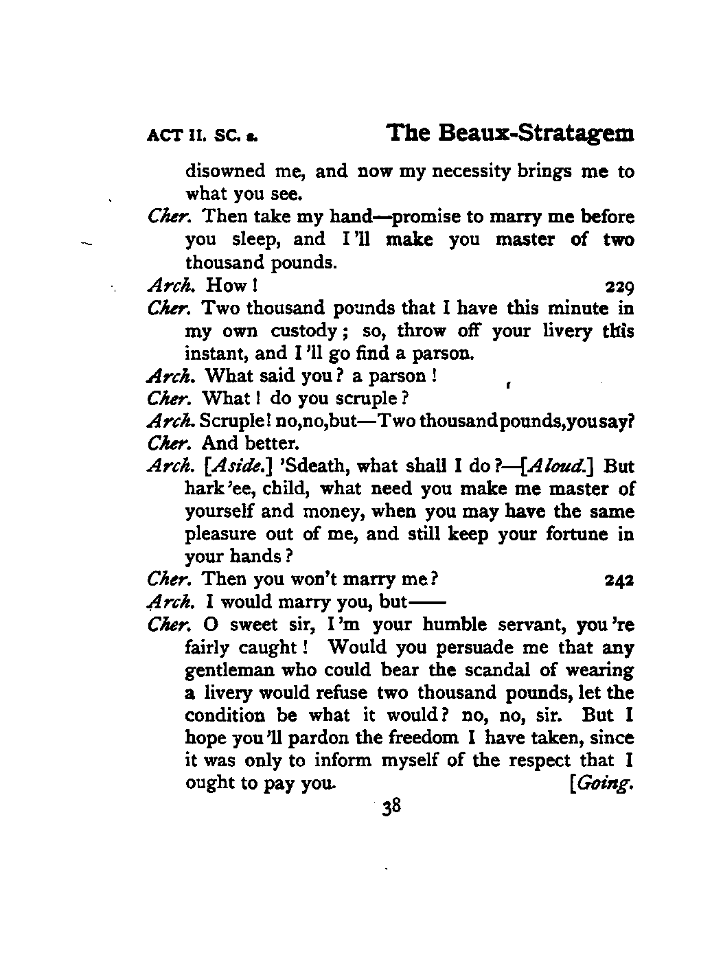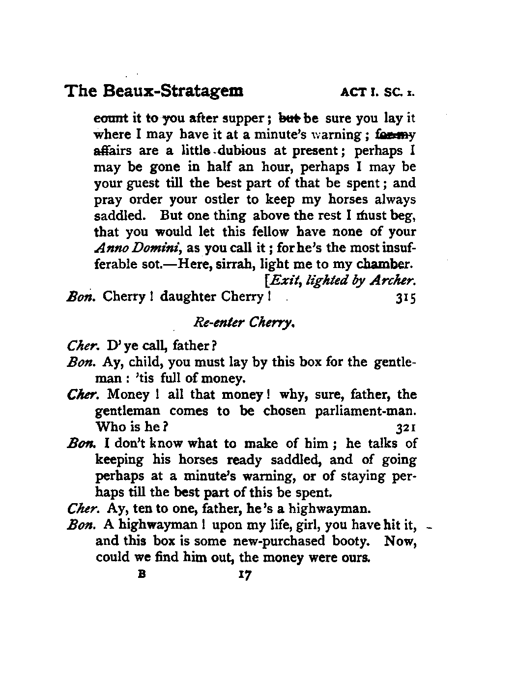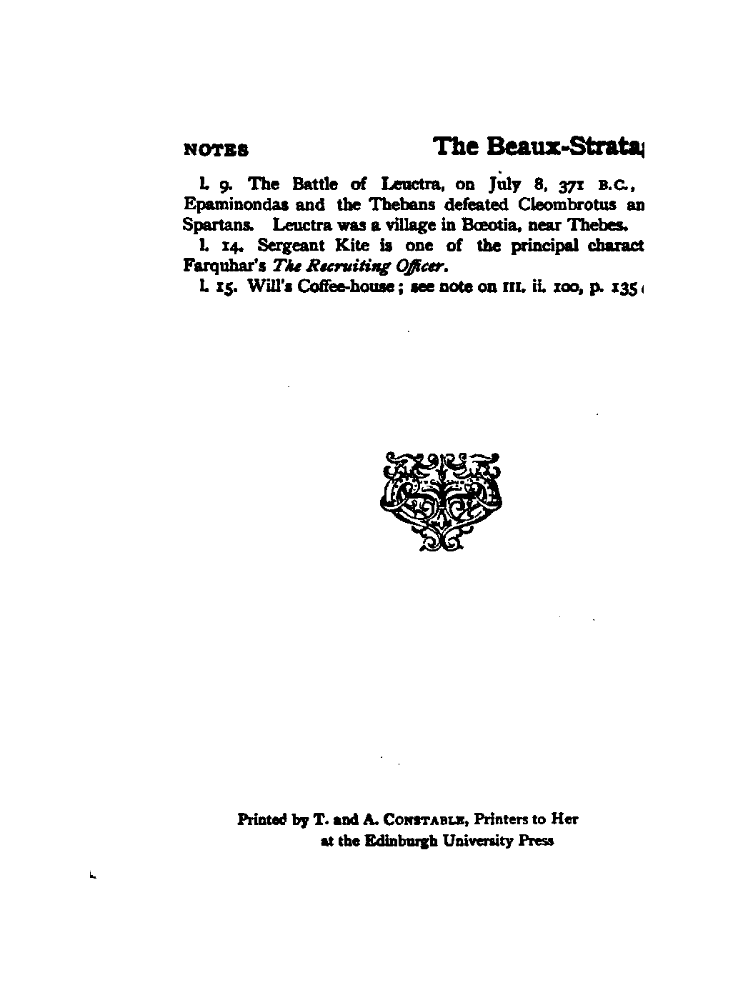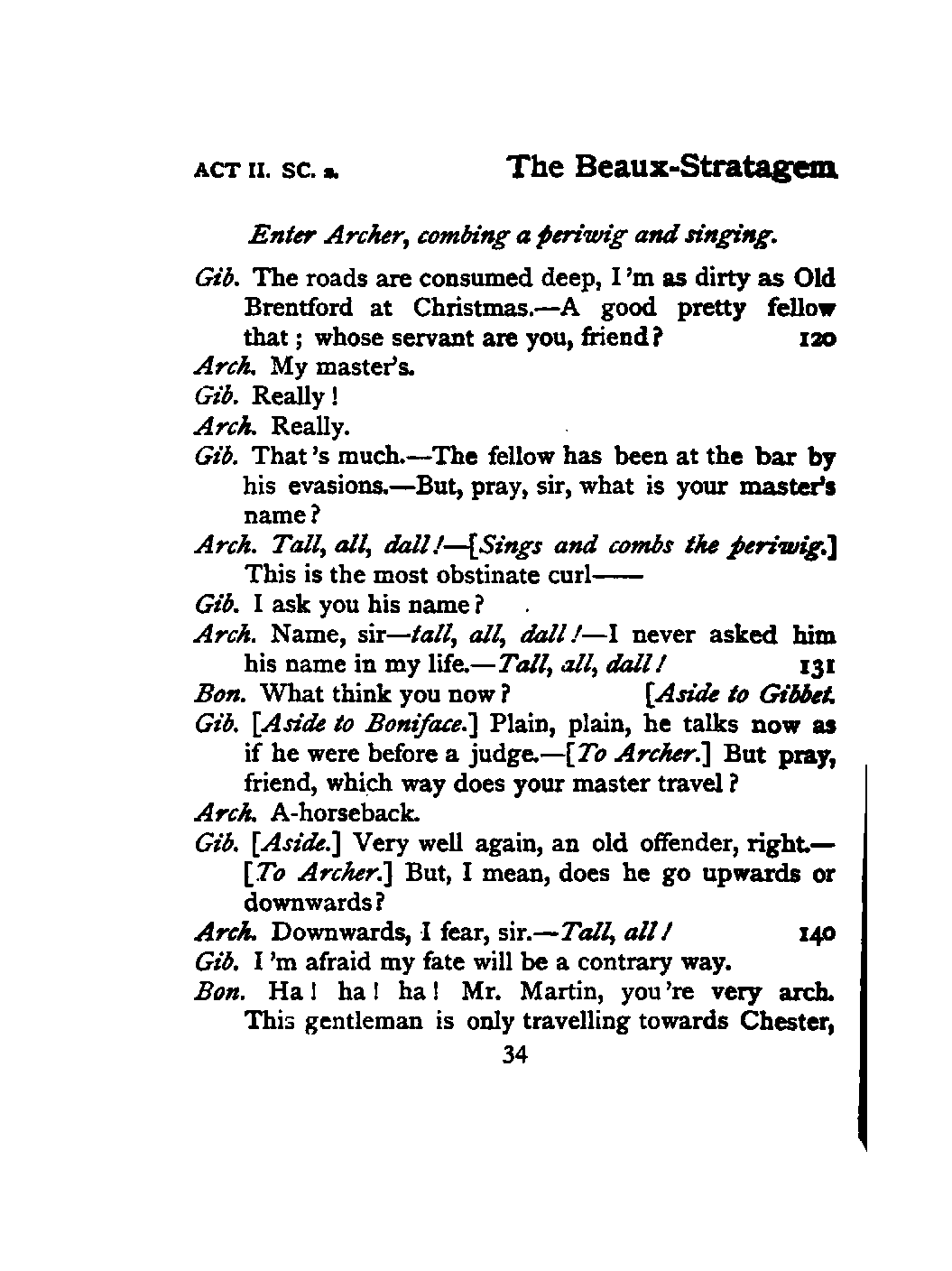 Bibliography. The first edition was published in a small quarto (78 pages) by Bernard Lintott, 'at the Cross-Keys next Nando's Coffeehouse in Fleet Street' between the two Temple gates. The British Museum Catalogue dates it 1707 (the copy in my possession, however, bears no date), but it is supposed not to have been published till 1710, three years after Farquhar's decease; whence some have erroneously dated his death in that year. Lintott, on January 27, 1707, had paid the dramatist £30. in advance for this play, double what he usually gave for a play. The same publisher issued the first complete edition of Farquhar's plays in an octavo volume, dedicated to John Eyre, with a quaint illustration prefixed to each play (we reproduce that prefixed to The Beaux-Stratagem), introducing all the characters of the play, and a frontispiece representing Farquhar being presented to Apollo by Ben Jonson. The general title-page is undated, but the title-pages of the various plays bear the date 1711, and all bear Lintott's name (sometimes alone, sometimes with others) save Sir Harry [xvi]Wildair, which is said to be printed by James Knapton. Some say this volume did not appear till 1714. In 1760 Rivington published an edition of Farquhar which appears to be slightly 'bowdlerised.' At least two complete editions of his works were published in Dublin; one, described as the seventh, in two volumes small octavo, by Risk and Smith, in 1743 (including a memoir, and Love and Business), in which the title-pages of the various plays bear different dates, ranging from 1727 to 1741, The Beaux-Stratagem being described as the twelfth edition, and dated 1739; the other, charmingly printed by Ewing in three 16mo volumes, dated 1775, with a vignette portrait and other illustrations, and containing a life by Thomas Wilkes. An Edinburgh edition of The Beaux-Stratagem, with life, appeared in 1768, and an edition in German in 1782 by J. Leonhardi, under the title Die Stutzerlist. Separate editions of the play also appeared in 1748, 1778, and 1824 (New York), and it is included in all the various collections of English plays, such as Bell's, Oxberry's, Inchbald's, Dibdin's, Cumberland's, etc., and in the collected editions of Farquhar's works dated 1718, 1728, 1736, 1742, 1760, and 1772. The principal modern editions of Farquhar are Leigh Hunt's (along with Wycherley, Vanbrugh, and Congreve), and Ewald's (1892), in two volumes large octavo.