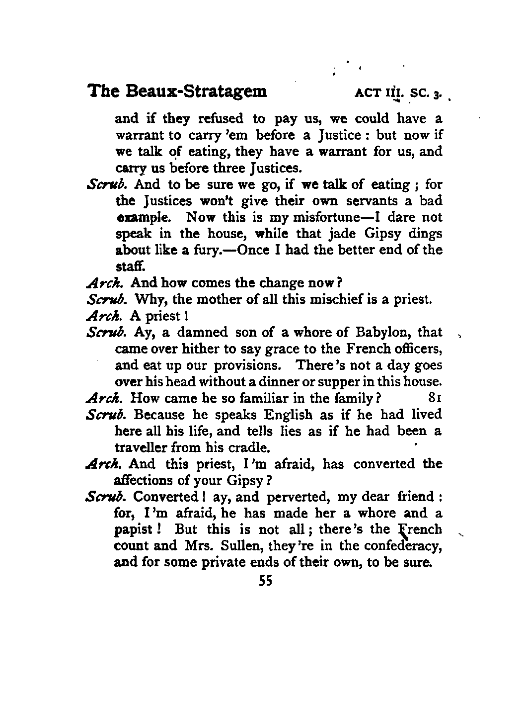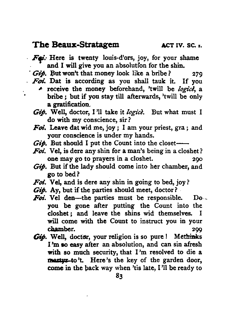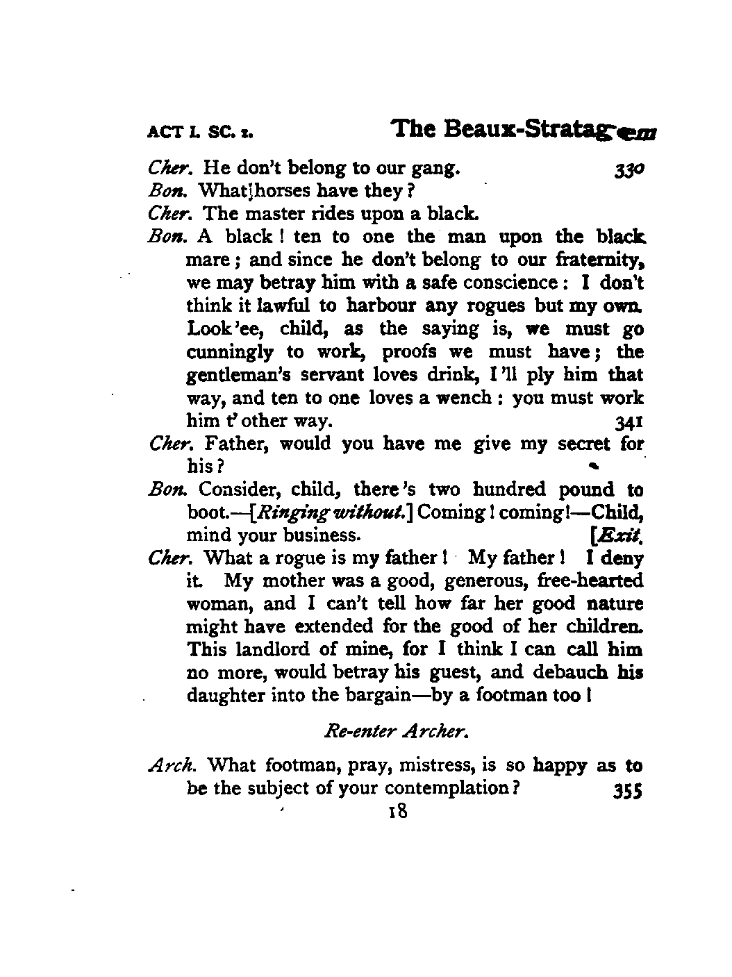 [ix]The Characters. This play has added several distinct original personages to our stock of comedy characters, and it affords an excellent and lifelike picture of a peculiar and perishing phase of the manners of the time, especially those obtaining in the country house, and the village inn frequented by highwaymen. The sly, rascally landlord, Boniface (who has given his name to the class), is said to have been drawn from life, and his portrait, we are told, was still to be seen at Lichfield in 1775. The inimitable 'brother Scrub,' that 'indispensable appendage to a country gentleman's kitchen' (Hazlitt), with his ignorance and shrewd eye to the main chance, is likewise said to have been a well-known personage who survived till 1759, one Thomas Bond, servant to Sir Theophilus Biddulph; others say he died at Salisbury in 1744. Although Farquhar, like Goldsmith, undoubtedly drew his incidents and personages from his own daily associations, there is probably no more truth in these surmises than in the assertion (repeatedly made, though denied in his preface to The Inconstant) that Farquhar depicts himself in his young heroes, his rollicking 'men about town,' Roebuck, Mirabel, Wildair, Plume, Archer. Archer (copied by Hoadley in his character of Ranger in The Suspicious Husband) is a decided improvement on his predecessors, and is the best of all Farquhar's creations; he is assuredly the most brilliant footman that ever was, eminently sociable and, with all his easy, rattling volubility, never forgetful of his self-respect and never indifferent to the wishes or welfare of others. As Hunt has pointed out, the characters of Archer and Aimwell improve as the play progresses; they set out as mere intriguers, but prove in the end true gentlemen. They are sad rogues, no doubt, but they have no bitter cynicism, no meanness; Aimwell [x]refuses to marry Dorinda under any deception. They thoroughly good fellows at bottom, manly, accomplished his spirited, eloquent, generous—the forerunners of Charles Surfor. Marriage retrieves them and turns them into respectable and adoring husbands. Though rattle-brained, much given to gallantry, and somewhat lax in morality, they are not knaves or monsters; they do not inspire disgust. Even the lumpish blockhead, Squire Sullen—according to Macaulay a type of the main strength of the Tory party for half a century after the Revolution—contrasts favourably with his prototype Sir John Brute in Vanbrugh's Provoked Wife, He is a sodden sot, who always goes to bed drunk, but he is not a demon; he does not beat his wife in public; he observes common decency somewhat. His wife is a witty, attractive, warm-hearted woman, whose faults are transparent; the chief one being that she has made the fatal mistake of marrying for fortune and position instead of for love. There is something pathetic in her position which claims our sympathy. She is well contrasted with her sister-in-law, the sincere, though somewhat weakly drawn, Dorinda; whilst their mother-in-law, Lady Bountiful, famed for her charity, is an amusing and gracious figure, which has often been copied. Cherry, with her honest heart and her quickness of perception, is also a distinct creation. Strange to say, the only badly drawn character is Foigard, the unscrupulous Irish Jesuit priest. Farquhar is fond of introducing an Irishman into each of his plays, but I cannot say that I think he is generally successful; certainly not in this instance. They are mostly broad caricatures, and speak an outlandish jargon, more like Welsh than Irish, supposed to be the Ulster dialect: anything more unlike it would be difficult to conceive. The early conventional stage Irishman, tracing him from Captain. Macmorris [xi]in Henry V.,through Ben Jonson's Irish Masque and New Inn, Dekker's Bryan, Ford's Mayor of Cork, Shadwell's O'Divelly (probably Farquhar's model for Foigard), is truly a wondrous savage, chiefly distinguished by his use of the expletives 'Dear Joy!' and 'By Creesh!' This character naturally rendered the play somewhat unpopular in Ireland, and its repulsiveness is unrelieved (as it is in the case of Teague in The Twin Rivals) by a single touch of humour or native comicality. It is an outrage.