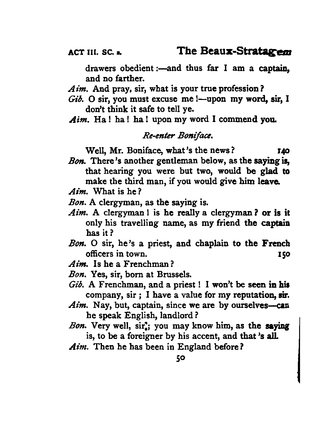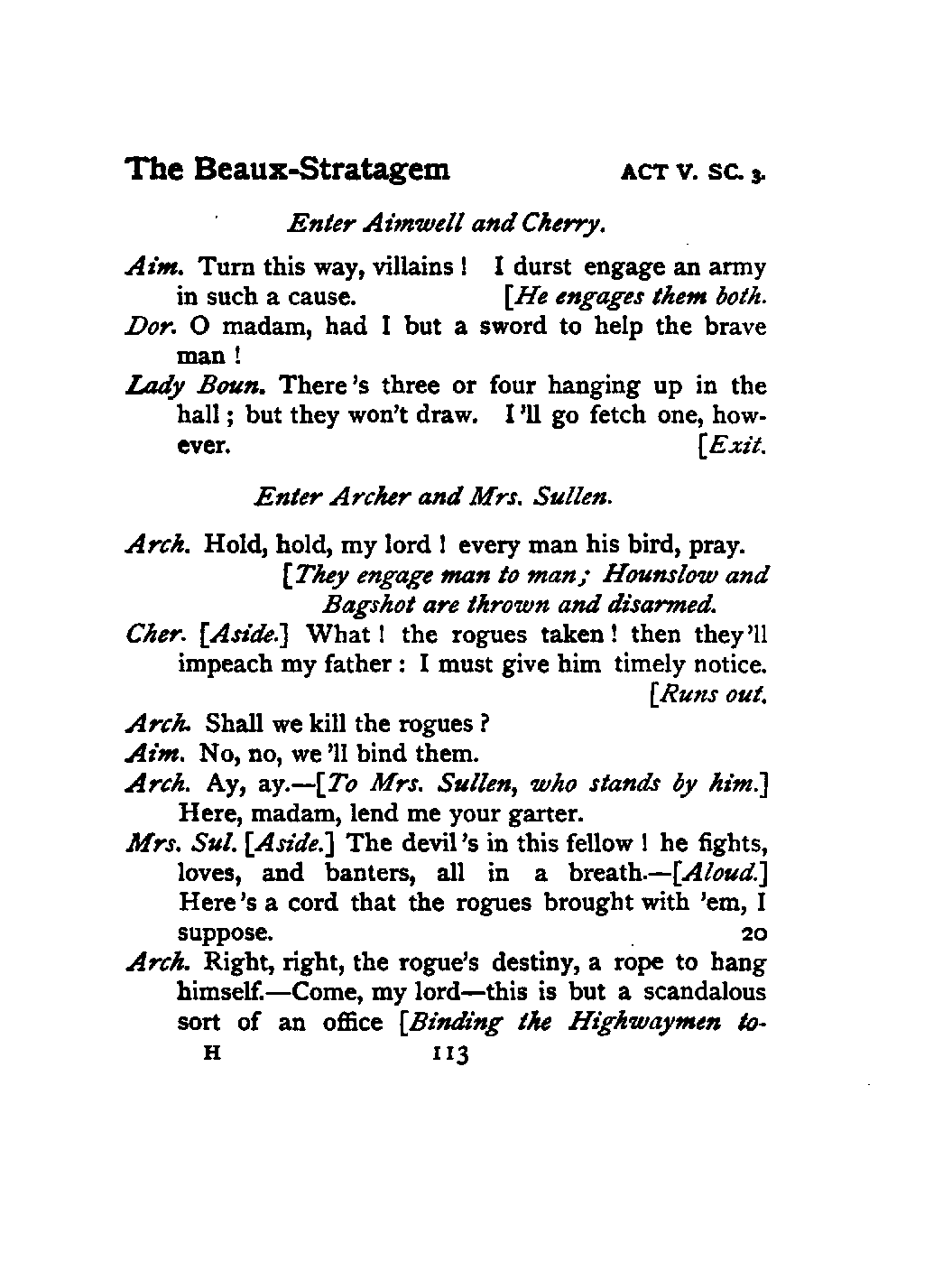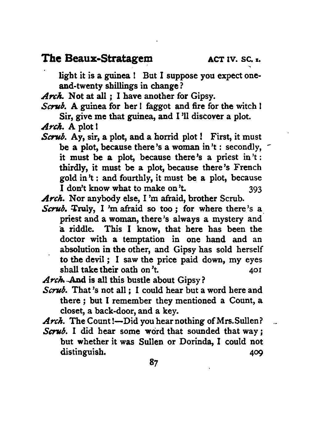 [ix]The Characters. This play has added several distinct original personages to our stock of comedy characters, and it affords an excellent and lifelike picture of a peculiar and perishing phase of the manners of the time, especially those obtaining in the country house, and the village inn frequented by highwaymen. The sly, rascally landlord, Boniface (who has given his name to the class), is said to have been drawn from life, and his portrait, we are told, was still to be seen at Lichfield in 1775. The inimitable 'brother Scrub,' that 'indispensable appendage to a country gentleman's kitchen' (Hazlitt), with his ignorance and shrewd eye to the main chance, is likewise said to have been a well-known personage who survived till 1759, one Thomas Bond, servant to Sir Theophilus Biddulph; others say he died at Salisbury in 1744. Although Farquhar, like Goldsmith, undoubtedly drew his incidents and personages from his own daily associations, there is probably no more truth in these surmises than in the assertion (repeatedly made, though denied in his preface to The Inconstant) that Farquhar depicts himself in his young heroes, his rollicking 'men about town,' Roebuck, Mirabel, Wildair, Plume, Archer. Archer (copied by Hoadley in his character of Ranger in The Suspicious Husband) is a decided improvement on his predecessors, and is the best of all Farquhar's creations; he is assuredly the most brilliant footman that ever was, eminently sociable and, with all his easy, rattling volubility, never forgetful of his self-respect and never indifferent to the wishes or welfare of others. As Hunt has pointed out, the characters of Archer and Aimwell improve as the play progresses; they set out as mere intriguers, but prove in the end true gentlemen. They are sad rogues, no doubt, but they have no bitter cynicism, no meanness; Aimwell [x]refuses to marry Dorinda under any deception. They thoroughly good fellows at bottom, manly, accomplished his spirited, eloquent, generous—the forerunners of Charles Surfor. Marriage retrieves them and turns them into respectable and adoring husbands. Though rattle-brained, much given to gallantry, and somewhat lax in morality, they are not knaves or monsters; they do not inspire disgust. Even the lumpish blockhead, Squire Sullen—according to Macaulay a type of the main strength of the Tory party for half a century after the Revolution—contrasts favourably with his prototype Sir John Brute in Vanbrugh's Provoked Wife, He is a sodden sot, who always goes to bed drunk, but he is not a demon; he does not beat his wife in public; he observes common decency somewhat. His wife is a witty, attractive, warm-hearted woman, whose faults are transparent; the chief one being that she has made the fatal mistake of marrying for fortune and position instead of for love. There is something pathetic in her position which claims our sympathy. She is well contrasted with her sister-in-law, the sincere, though somewhat weakly drawn, Dorinda; whilst their mother-in-law, Lady Bountiful, famed for her charity, is an amusing and gracious figure, which has often been copied. Cherry, with her honest heart and her quickness of perception, is also a distinct creation. Strange to say, the only badly drawn character is Foigard, the unscrupulous Irish Jesuit priest. Farquhar is fond of introducing an Irishman into each of his plays, but I cannot say that I think he is generally successful; certainly not in this instance. They are mostly broad caricatures, and speak an outlandish jargon, more like Welsh than Irish, supposed to be the Ulster dialect: anything more unlike it would be difficult to conceive. The early conventional stage Irishman, tracing him from Captain. Macmorris [xi]in Henry V.,through Ben Jonson's Irish Masque and New Inn, Dekker's Bryan, Ford's Mayor of Cork, Shadwell's O'Divelly (probably Farquhar's model for Foigard), is truly a wondrous savage, chiefly distinguished by his use of the expletives 'Dear Joy!' and 'By Creesh!' This character naturally rendered the play somewhat unpopular in Ireland, and its repulsiveness is unrelieved (as it is in the case of Teague in The Twin Rivals) by a single touch of humour or native comicality. It is an outrage.