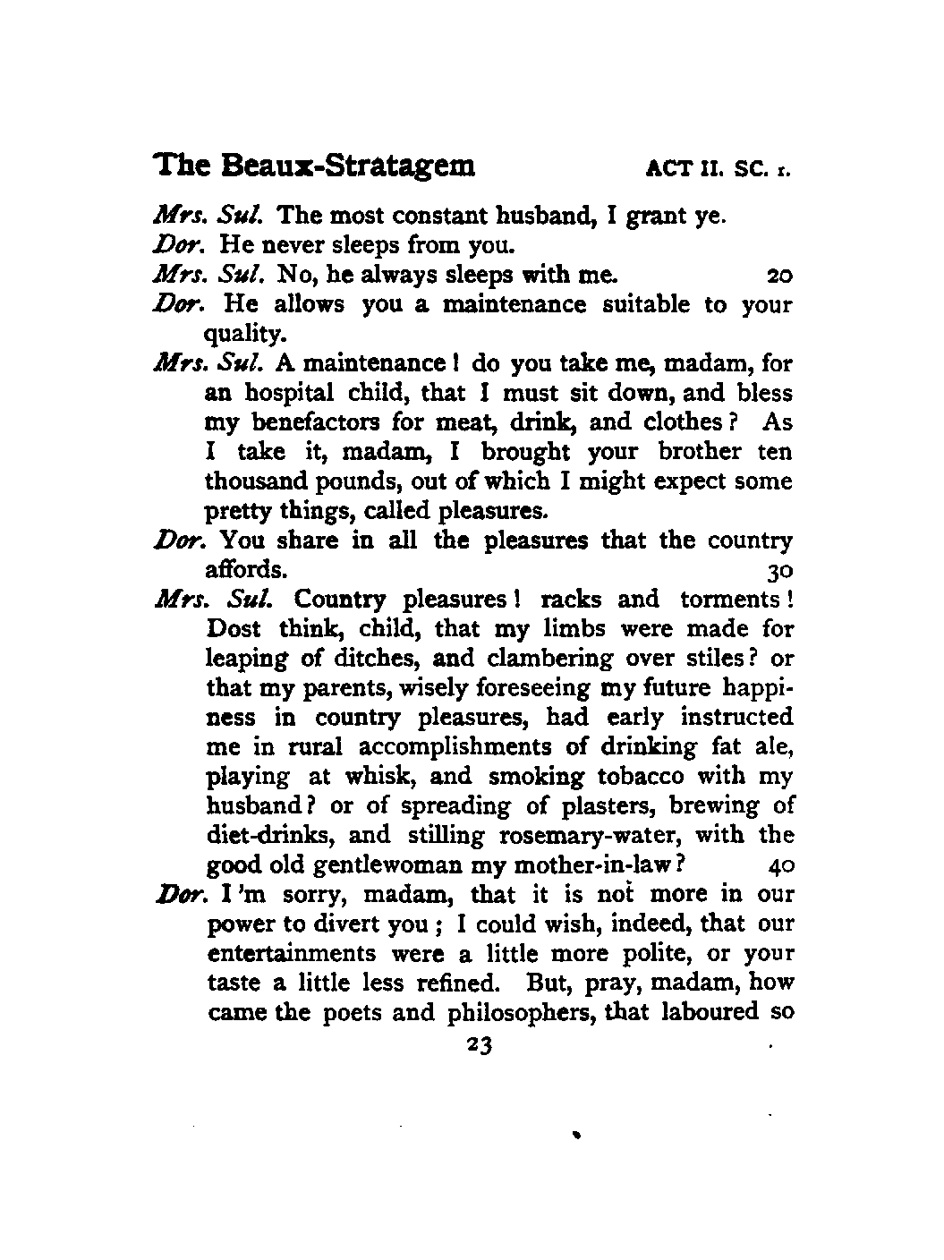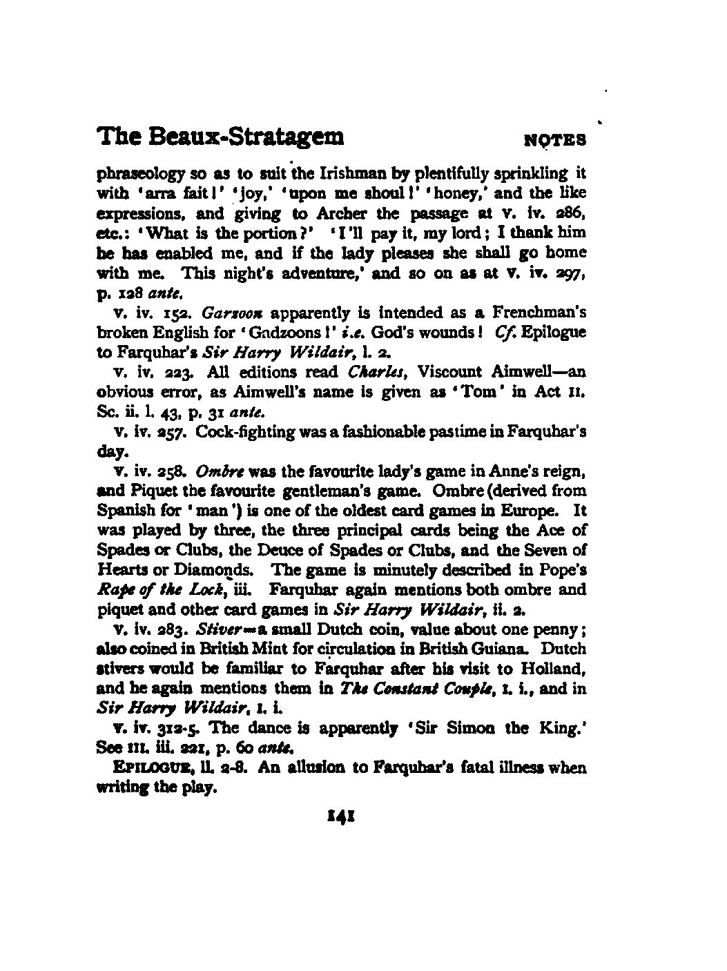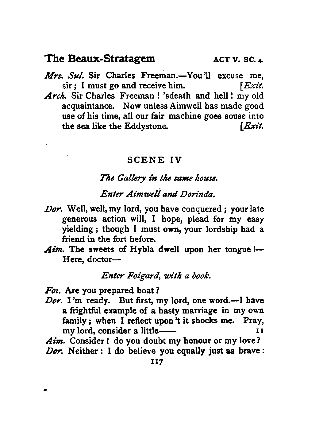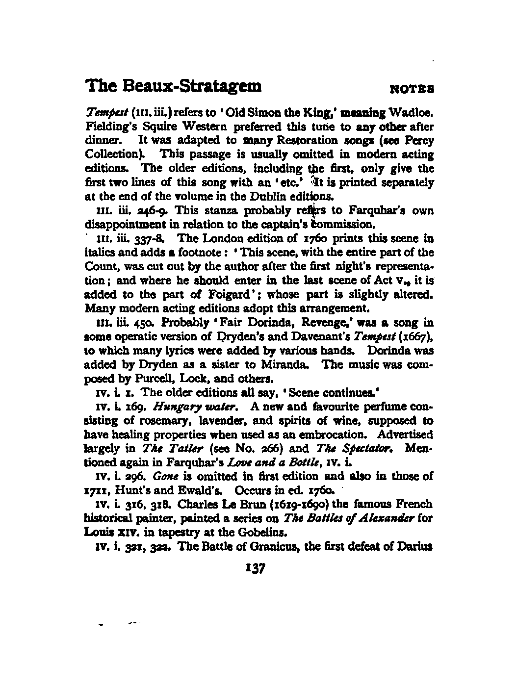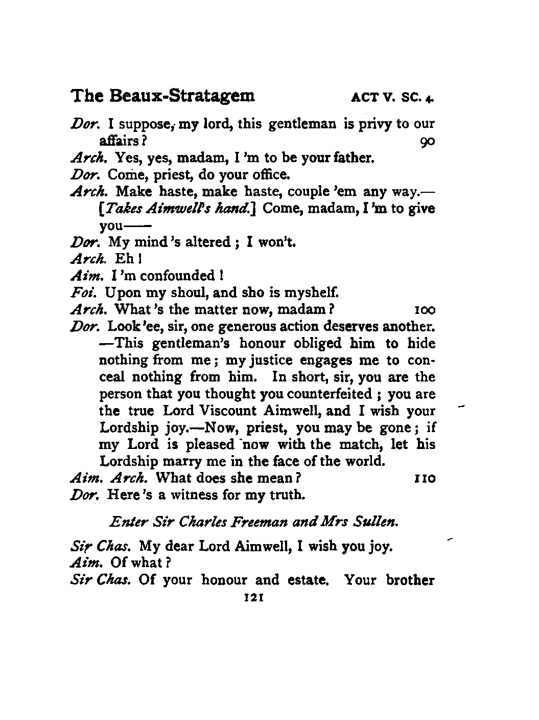 The style adopted is highly dramatic, the dialogue being natural and flowing; trenchant and sprightly, but not too witty for a truthful reflex of actual conversation. The humour is genial and unforced; there is no smell of the lamp about it, no premeditated effort at dragging in jests, as in Congreve. As typical examples of Farquhar's vis comica I Would cite the description of Squire Sullen's home-coming, and his 'pot of ale' speech, Aimwell's speech respecting conduct at church, the scene between Cherry and Archer about the £2000, and the [viii]final separation scene—which affords a curious view of the marriage tie and on which Leigh Hunt has founded an argument for divorce. This play contains several examples of Farquhar's curious habit of breaking out into a kind of broken blank verse occasionally for a few lines in the more serious passages. Partaking as it does of the elements of both comedy and force, it is the prototype of Goldsmith's She Stoops to Conquer, which it resembles in many respects. It will be remembered that Miss Hardcastle compares herself to Cherry (Act III.), and young Marlow and Hastings much resemble Archer and Aimwell. Goldsmith was a great admirer of the works of his fellow-countryman, especially The Beaux-Stratagem, and refers to them several times (Citizen of the World, letter 93; History of England, letter 16; Vicar of Wakefield, ch. 18), and in the Literary Magazine for 1758 he drew up a curious poetical scale in which he classes the Restoration dramatists thus:— Congreve—Genius 15, Judgment 16, Learning 14, Versification 14; Vanbrugh—14, 15,14,10; Farquhar—15, 15, 10, io. Unlike Goldsmith, unhappily, Farquhar's moral tone is not high; sensuality is confounded with love, ribaldry mistaken for wit The best that can be said of him that he contrasts favourably with his contemporary dramatists; Virtue is not always uninteresting in his pages. He is free from their heartlessness, malignity, and cruelty. The plot of The Beaux-Stratagem is comparatively inoffensive, and the moral of the whole is healthy. Although a wit rather than a thinker, Farquhar in this play shows himself capable of serious feelings. It is remarkable how much Farquhar repeats himself. Hardly an allusion or idea occurs in this play that is not to be found elsewhere in his works. In the Notes I have pointed out many of these coincidences.
