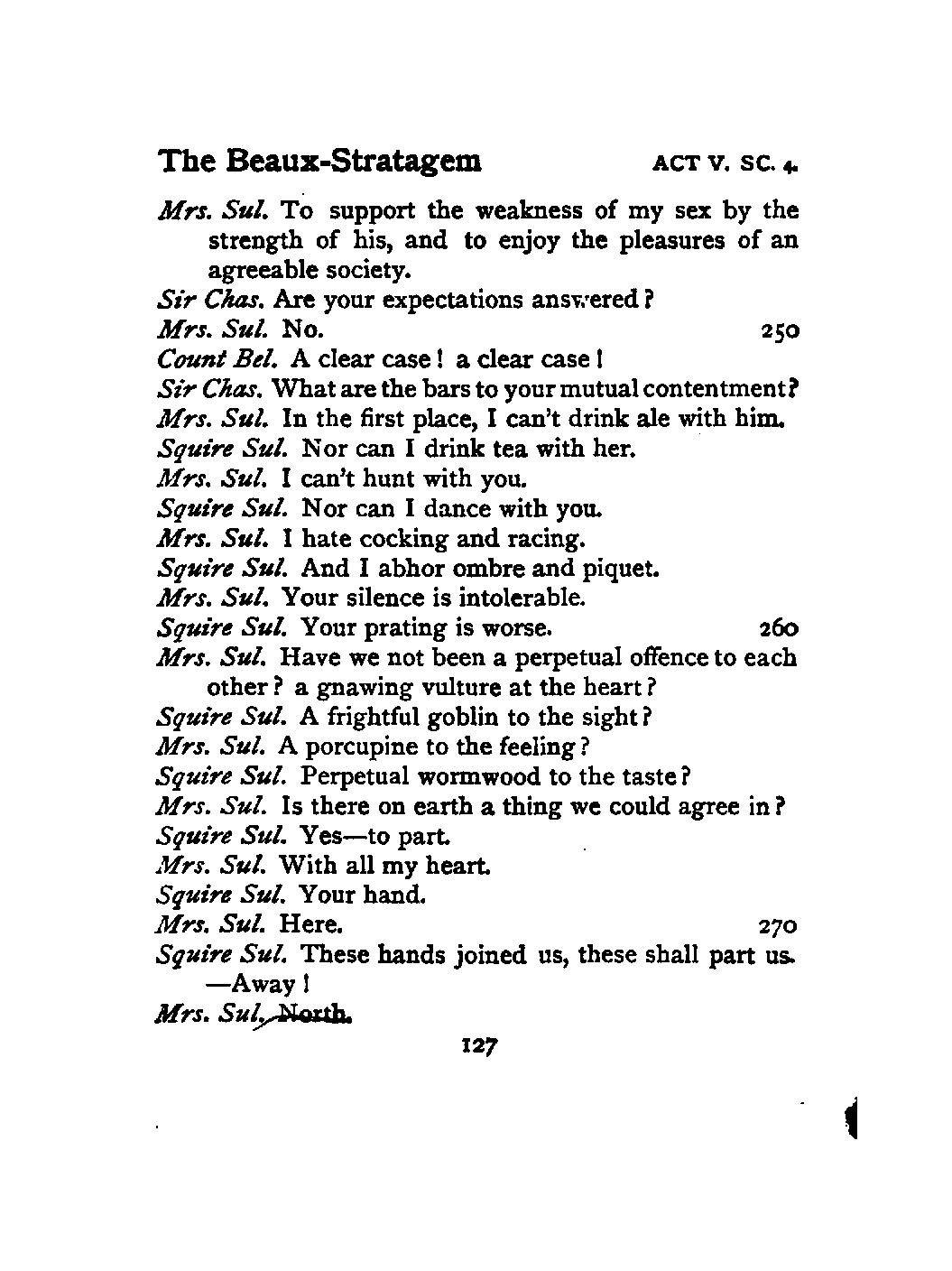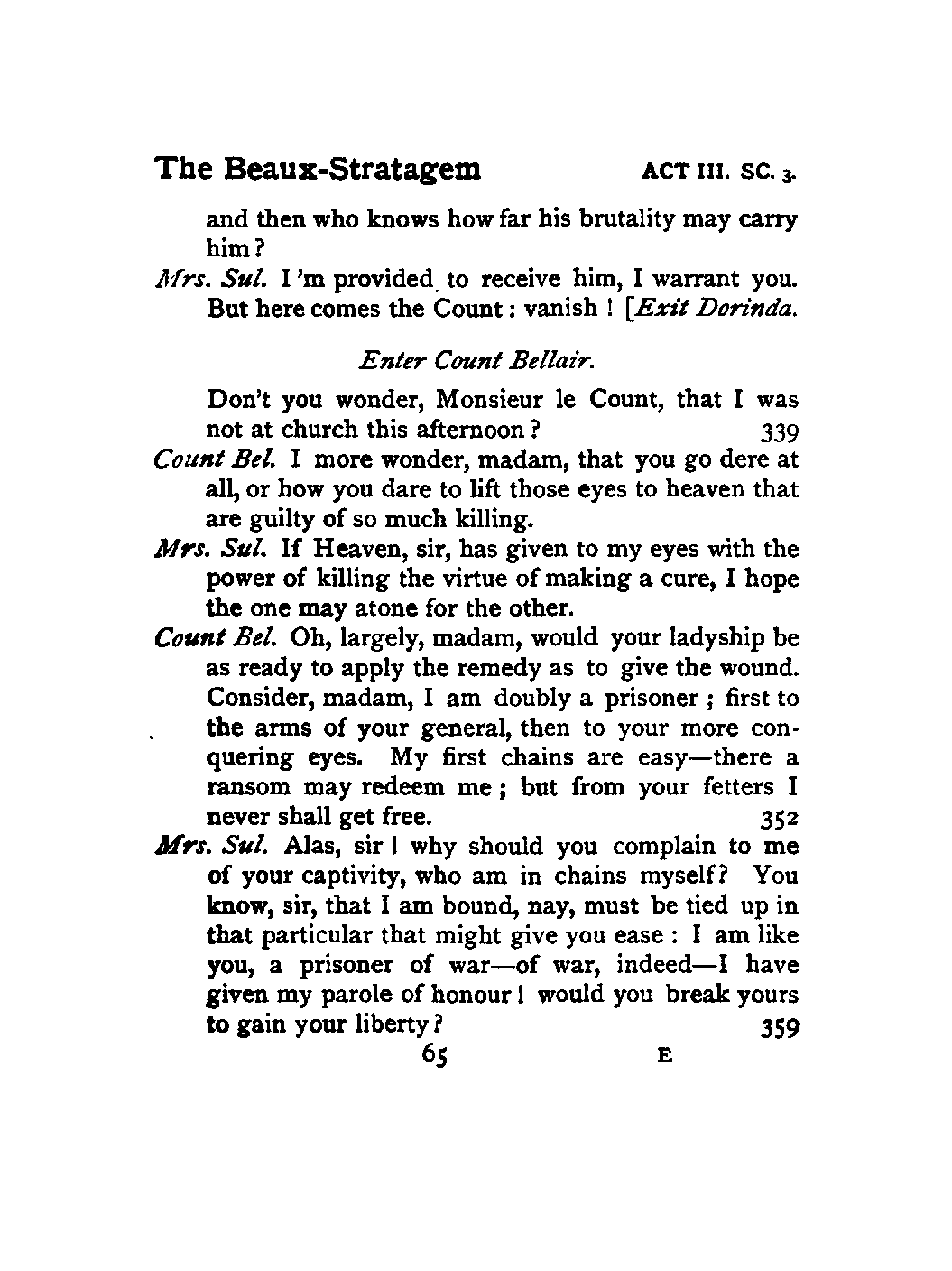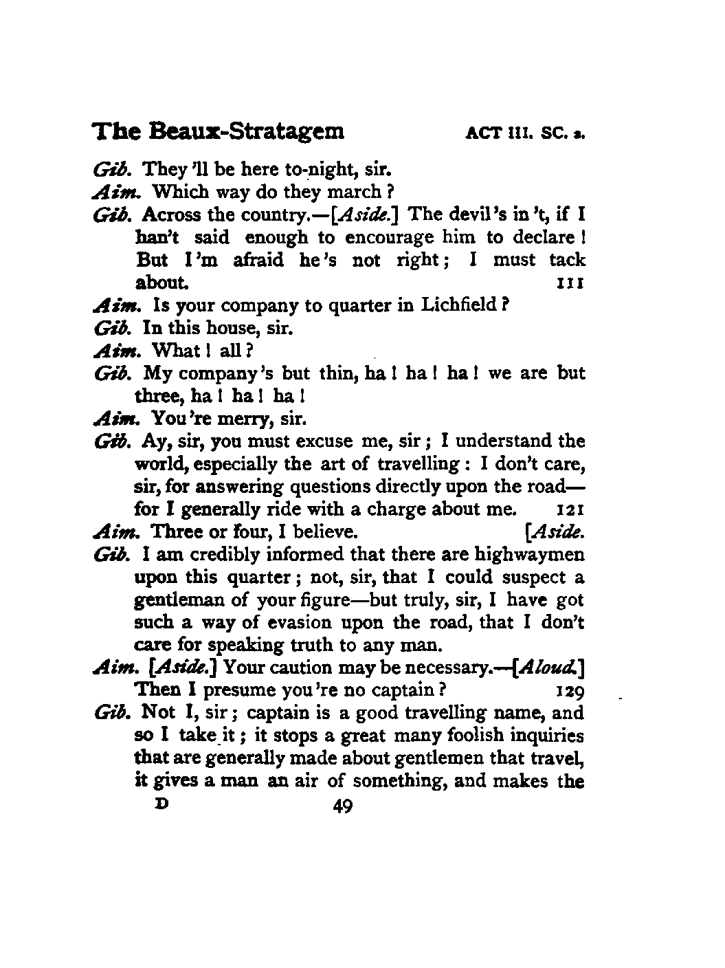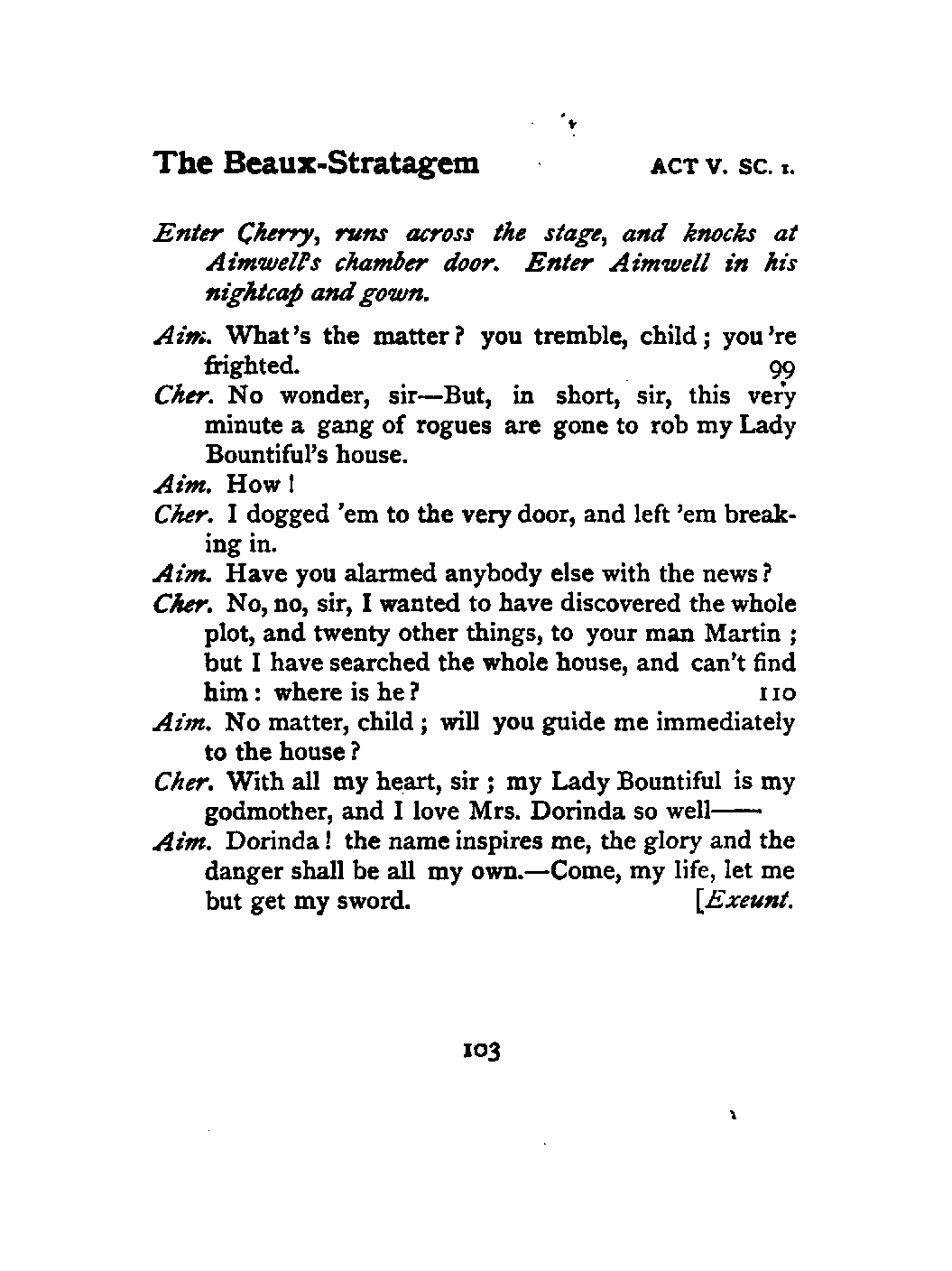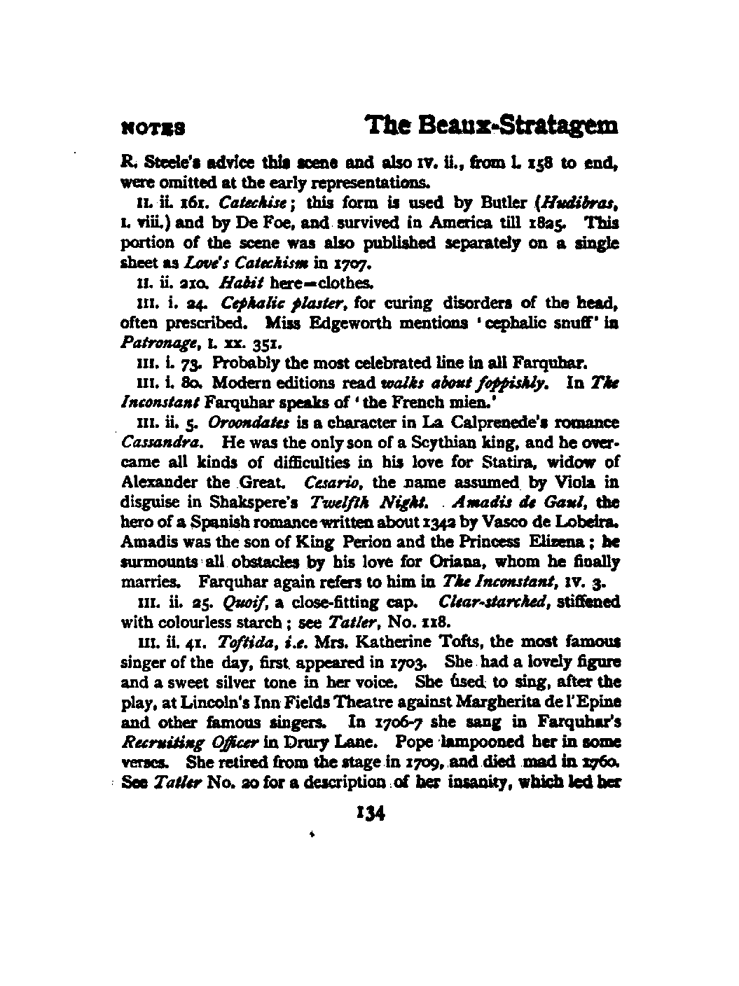 The style adopted is highly dramatic, the dialogue being natural and flowing; trenchant and sprightly, but not too witty for a truthful reflex of actual conversation. The humour is genial and unforced; there is no smell of the lamp about it, no premeditated effort at dragging in jests, as in Congreve. As typical examples of Farquhar's vis comica I Would cite the description of Squire Sullen's home-coming, and his 'pot of ale' speech, Aimwell's speech respecting conduct at church, the scene between Cherry and Archer about the £2000, and the [viii]final separation scene—which affords a curious view of the marriage tie and on which Leigh Hunt has founded an argument for divorce. This play contains several examples of Farquhar's curious habit of breaking out into a kind of broken blank verse occasionally for a few lines in the more serious passages. Partaking as it does of the elements of both comedy and force, it is the prototype of Goldsmith's She Stoops to Conquer, which it resembles in many respects. It will be remembered that Miss Hardcastle compares herself to Cherry (Act III.), and young Marlow and Hastings much resemble Archer and Aimwell. Goldsmith was a great admirer of the works of his fellow-countryman, especially The Beaux-Stratagem, and refers to them several times (Citizen of the World, letter 93; History of England, letter 16; Vicar of Wakefield, ch. 18), and in the Literary Magazine for 1758 he drew up a curious poetical scale in which he classes the Restoration dramatists thus:— Congreve—Genius 15, Judgment 16, Learning 14, Versification 14; Vanbrugh—14, 15,14,10; Farquhar—15, 15, 10, io. Unlike Goldsmith, unhappily, Farquhar's moral tone is not high; sensuality is confounded with love, ribaldry mistaken for wit The best that can be said of him that he contrasts favourably with his contemporary dramatists; Virtue is not always uninteresting in his pages. He is free from their heartlessness, malignity, and cruelty. The plot of The Beaux-Stratagem is comparatively inoffensive, and the moral of the whole is healthy. Although a wit rather than a thinker, Farquhar in this play shows himself capable of serious feelings. It is remarkable how much Farquhar repeats himself. Hardly an allusion or idea occurs in this play that is not to be found elsewhere in his works. In the Notes I have pointed out many of these coincidences.