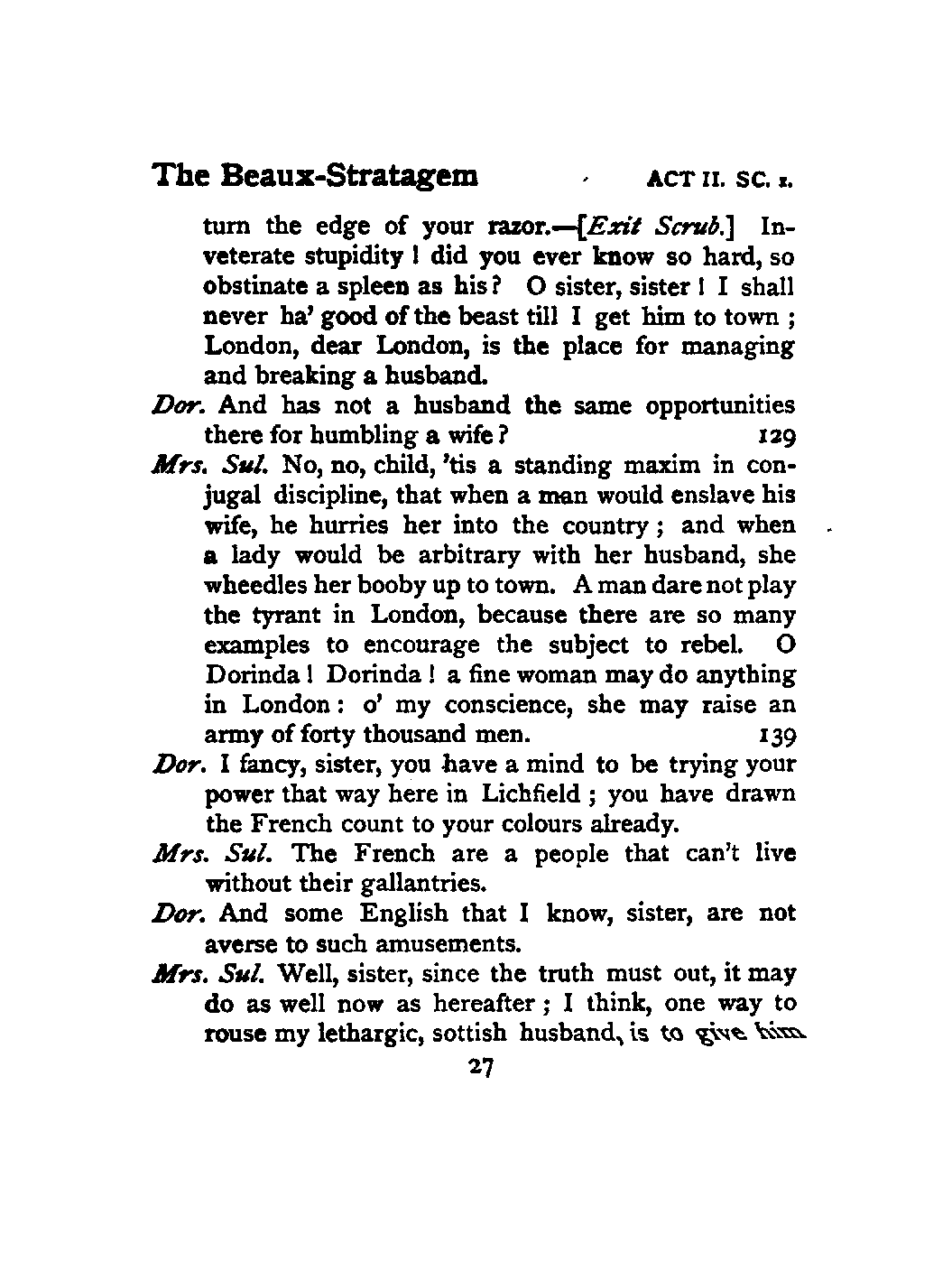 The Author. 'It is surprising,' says Mr. Percy Fitzgerald, 'how much English Comedy owes to Irishmen.' Nearly fifty years ago Calcraft enumerated eighty-seven Irish dramatists in a by no means exhaustive list, including Congreve, Southerne, Steele, Kelly, Macklin, and Farquhar—the really Irish representative amongst the dramatists of the Restoration, the true prototype of Goldsmith and Sheridan. Thoroughly Irish by birth and education, Captain George Farquhar (1677-1707) had delighted the town with a succession of bright, rattling comedies—Love and a Bottle (1698), The Constant Couple (1699), Sir Harry Wildair (1701), The Inconstant (1702), The Twin Rivals (1702), The Recruiting Officer (1706). In an unlucky moment, when hard pressed by his debts, he sold out of the army on the strength of a promise by the Duke of Ormond to gain him some preferment, which never came. In his misery and poverty, with a wife and two helpless girls to support, Farquhar was not forsaken by his one true friend, Robert Wilks. Seeking out the dramatist in his wretched garret in St Martin's Lane, the actor advised him no longer to trust to great men's promises, but to look only to his pen for support, and urged him to write another play. 'Write!' said Farquhar, starting from his chair; 'is it possible that a man can write with common-sense who is heartless and has not a shilling in his pockets?' 'Come, come, George,' said Wilks, 'banish melancholy, draw up your drama, and bring your sketch with you to-morrow, for I expect you to dine with me. But as [vi]an empty purse may cramp your genius, I desire you to accept my mite; here is twenty guineas.' Farquhar set to work, and brought the plot of his play to Wilks the next day; the later approved the design, and urged him to proceed without delay. Mostly written in bed, the whole was begun, finished, and acted within six weeks. The author designed to dedicate it to Lord Cadogan, but his lordship, for reasons unknown, declined the honour; he gave the dramatist a handsome present, however. Thus was The Beaux-Stratagem written. Farquhar is said to have felt the approaches of death ere he finished the second act. On the night of the first performance Wilks came to tell him of his great success, but mentioned that Mrs. Oldfield wished that he could have thought of some more legitimate divorce in order to secure the honour of Mrs. Sullen. 'Oh,' said Farquhar, 'I will, if she pleases, solve that immediately, by getting a real divorce; marrying her myself, and giving her my bond that she shall be a widow in less than a fortnight' Subsequent events practically fulfilled this prediction, for Farquhar died during the run of the play: on the day of his extra benefit, Tuesday, 29th April 1707, the plaudits of the audience resounding in his ears, the destitute, broken-hearted dramatist passed to that bourne where stratagems avail not any longer.