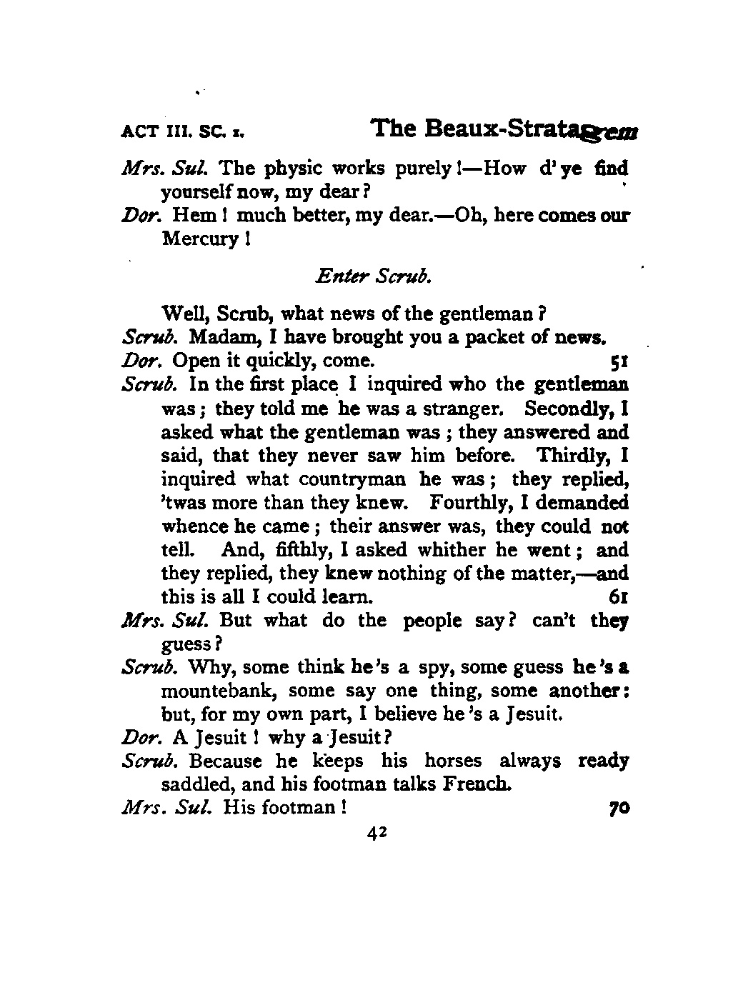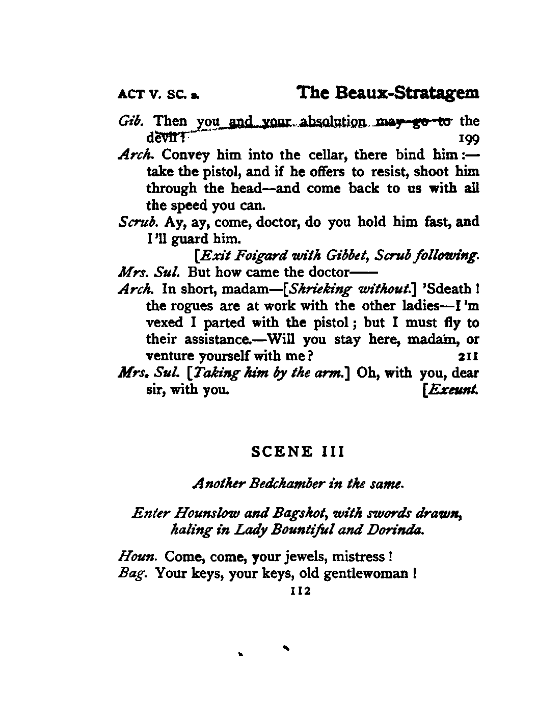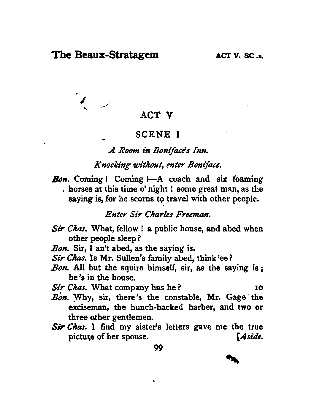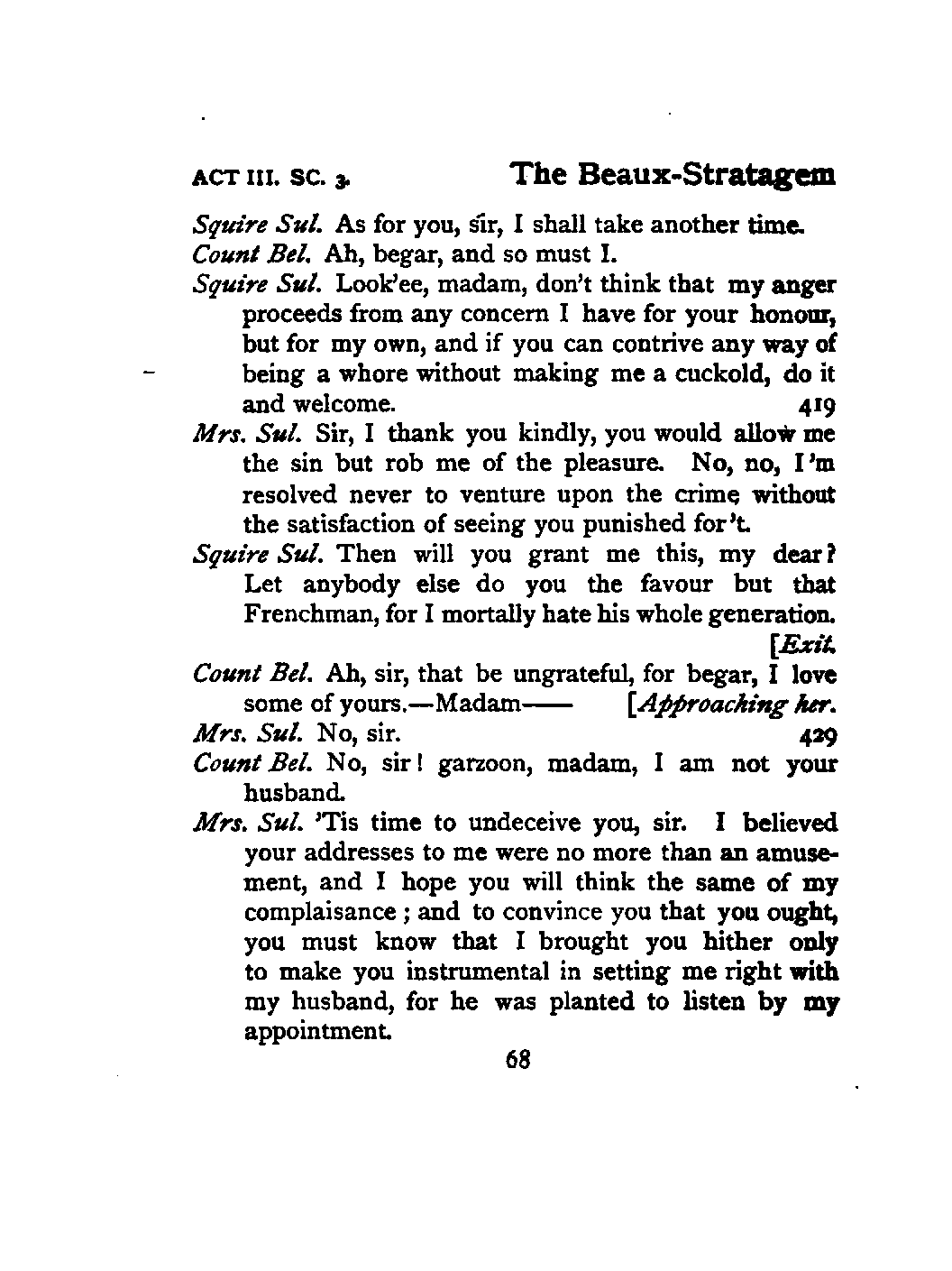 Later Stage History. Originally brought out under the title The Stratagem only, which it retained in the playbills till 1787 (though printed with 'Beaux'), this play continued to be very popular with the stage down to the dawn of the present century; and many great actors and actresses appeared from time to time in its characters; In 1721 Quin acted in Lincoln's Inn Fields as Squire Sullen. The part of Mrs. Sullen has been undertaken by Mrs. Pritchard (1740 and 1761), Peg Woffington (1742, along with Garrick as Archer for the first time, and Macklin as Scrub), Mrs. Abington (1774, 1785, 1798), Mrs. Barry (1778), Miss Farren (1779), Mrs. Jordan (1802), Mrs. C. Kemble (1810), Mrs. Davison (1818), and Miss Chester (1823, for Dibdin's benefit, with Liston as Scrub). Garrick's repeated performances of Archer, in light blue and silver livery, were supremely good, more particularly in the scenes with Cherry, the picture scene with Mrs. Sullen, and when he delivers Lady Howd'ye's message. He generally acted with Weston, an inimitable Scrub; but at O'Brien's benefit at Drury Lane, 10th April 1761, Garrick himself played Scrub to O'Brien's Archer. On one occasion Garrick had refused Weston a loan of money, and Weston not appearing at the greenroom, Garrick came forward before the curtain and announced that he would himself play Scrub, as Weston was ill. Weston, who was in the gallery with a sham bailiff, shouted out, 'I am here, but the bailiff won't let me come '; whereupon the audience insisted on Garrick's paying the loan and relieving the debtor so as to [xiv]enable him to play Scrub! Other famous Scrubs were Shutes (1774), Quick (1778, 1785, 1798), Bannister, junior (1802, will C. Kemble as Aimwell), Dowton (1802), Liston (1810), Johnstone (1821), and Keeley (1828, with C. Kemble as Arches and Miss Foote as Cherry; it ran for twelve nights at Covenl Garden). Goldsmith is said to have expressed a desire to art this part. On the occasion of Mrs. Abington's benefit (Covenl Garden, November 19, 1785), she took the part of Scrub for that night only, for a wager, it is said. Ladies were desired to send their servants to retain seats by four o'clock, and the pit and boxes were laid together. She disgraced herself, acting the part with her hair dressed for 'Lady Racket' in the afterpiece (Three Hours After Marriage). In April 1823 another female impersonator of this part appeared—not very successfully—in Miss Clara Fisher, with Farren as Archer. This was in Dublin (Hawkins' Street), where the play was frequently performed about 1821-1823. It was also the piece chosen for the re-opening of Smock Alley Theatre, Dublin, in 1759, when Mrs. Abington made her first appearance on the Irish stage as Mrs. Sullen.