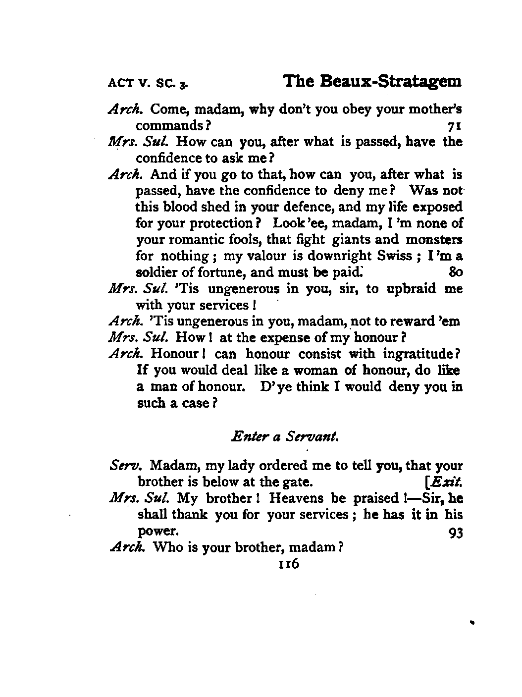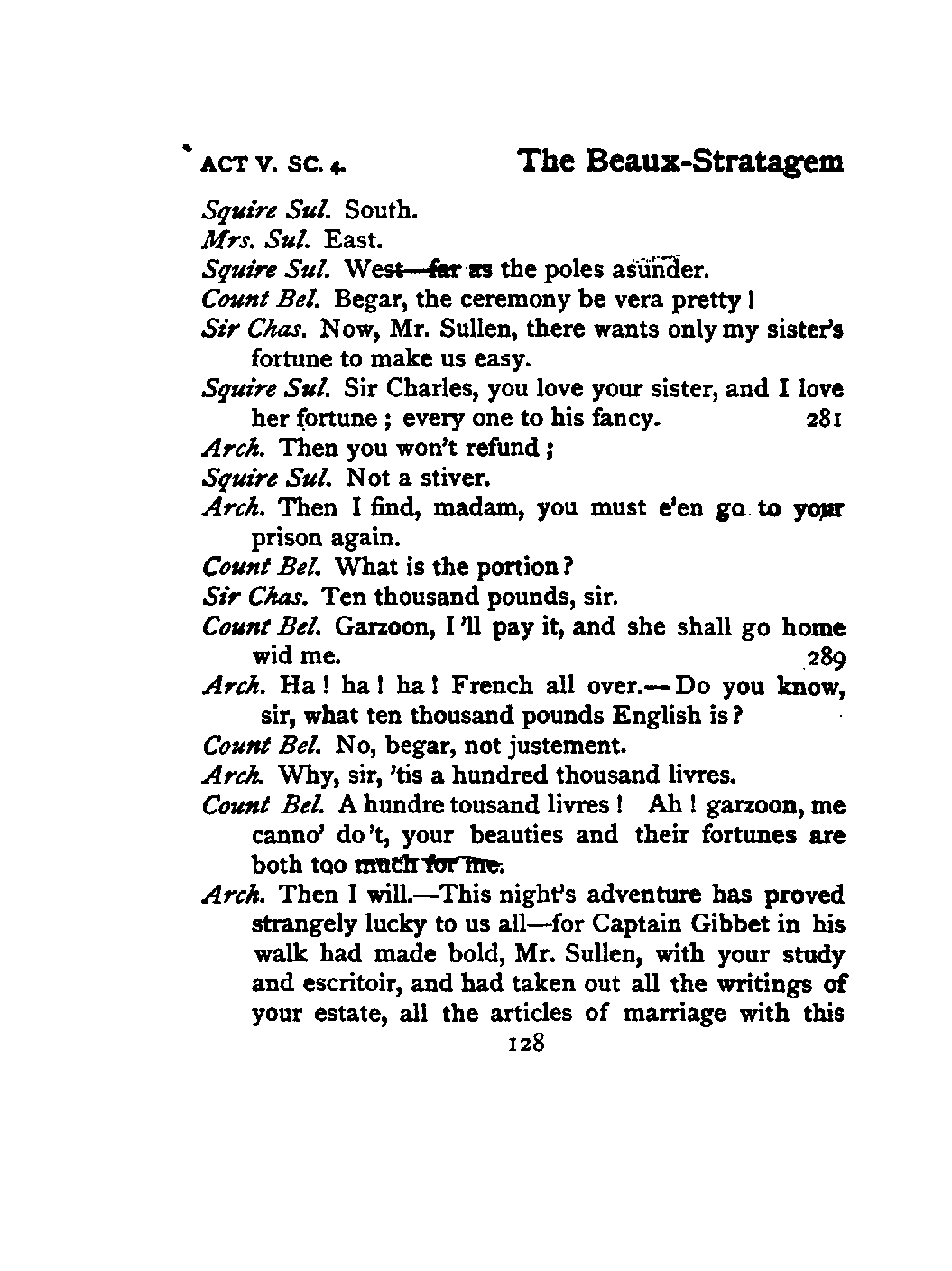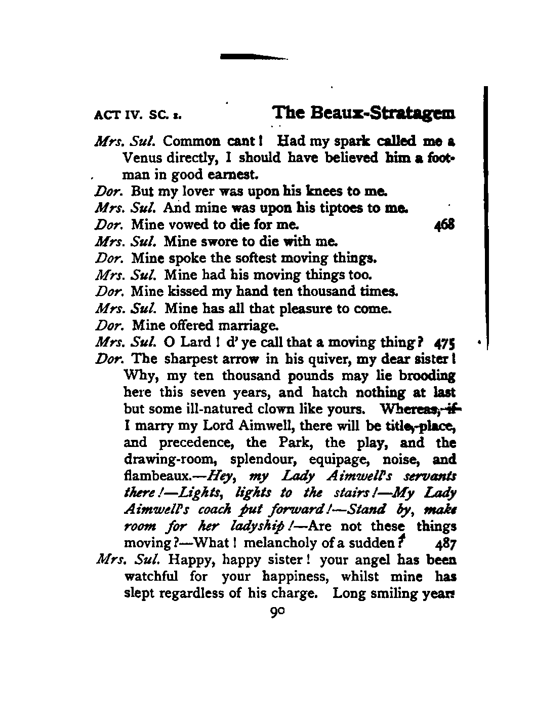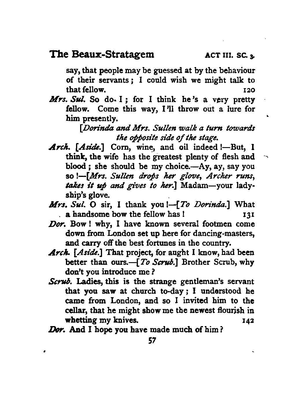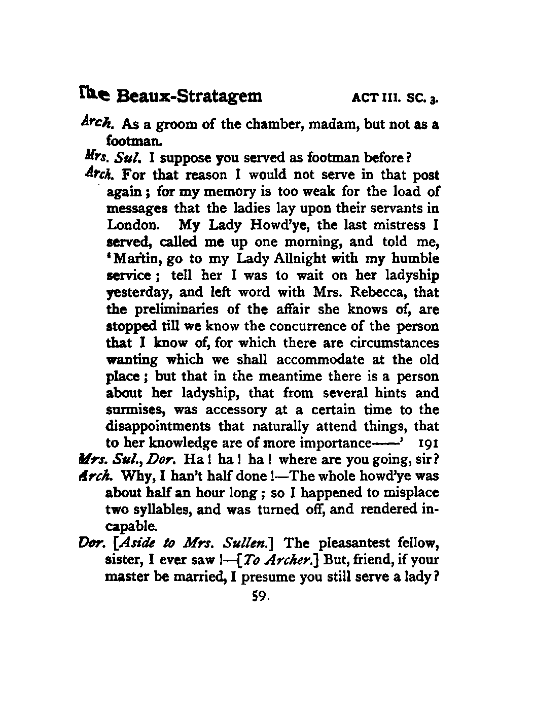 Later Stage History. Originally brought out under the title The Stratagem only, which it retained in the playbills till 1787 (though printed with 'Beaux'), this play continued to be very popular with the stage down to the dawn of the present century; and many great actors and actresses appeared from time to time in its characters; In 1721 Quin acted in Lincoln's Inn Fields as Squire Sullen. The part of Mrs. Sullen has been undertaken by Mrs. Pritchard (1740 and 1761), Peg Woffington (1742, along with Garrick as Archer for the first time, and Macklin as Scrub), Mrs. Abington (1774, 1785, 1798), Mrs. Barry (1778), Miss Farren (1779), Mrs. Jordan (1802), Mrs. C. Kemble (1810), Mrs. Davison (1818), and Miss Chester (1823, for Dibdin's benefit, with Liston as Scrub). Garrick's repeated performances of Archer, in light blue and silver livery, were supremely good, more particularly in the scenes with Cherry, the picture scene with Mrs. Sullen, and when he delivers Lady Howd'ye's message. He generally acted with Weston, an inimitable Scrub; but at O'Brien's benefit at Drury Lane, 10th April 1761, Garrick himself played Scrub to O'Brien's Archer. On one occasion Garrick had refused Weston a loan of money, and Weston not appearing at the greenroom, Garrick came forward before the curtain and announced that he would himself play Scrub, as Weston was ill. Weston, who was in the gallery with a sham bailiff, shouted out, 'I am here, but the bailiff won't let me come '; whereupon the audience insisted on Garrick's paying the loan and relieving the debtor so as to [xiv]enable him to play Scrub! Other famous Scrubs were Shutes (1774), Quick (1778, 1785, 1798), Bannister, junior (1802, will C. Kemble as Aimwell), Dowton (1802), Liston (1810), Johnstone (1821), and Keeley (1828, with C. Kemble as Arches and Miss Foote as Cherry; it ran for twelve nights at Covenl Garden). Goldsmith is said to have expressed a desire to art this part. On the occasion of Mrs. Abington's benefit (Covenl Garden, November 19, 1785), she took the part of Scrub for that night only, for a wager, it is said. Ladies were desired to send their servants to retain seats by four o'clock, and the pit and boxes were laid together. She disgraced herself, acting the part with her hair dressed for 'Lady Racket' in the afterpiece (Three Hours After Marriage). In April 1823 another female impersonator of this part appeared—not very successfully—in Miss Clara Fisher, with Farren as Archer. This was in Dublin (Hawkins' Street), where the play was frequently performed about 1821-1823. It was also the piece chosen for the re-opening of Smock Alley Theatre, Dublin, in 1759, when Mrs. Abington made her first appearance on the Irish stage as Mrs. Sullen.