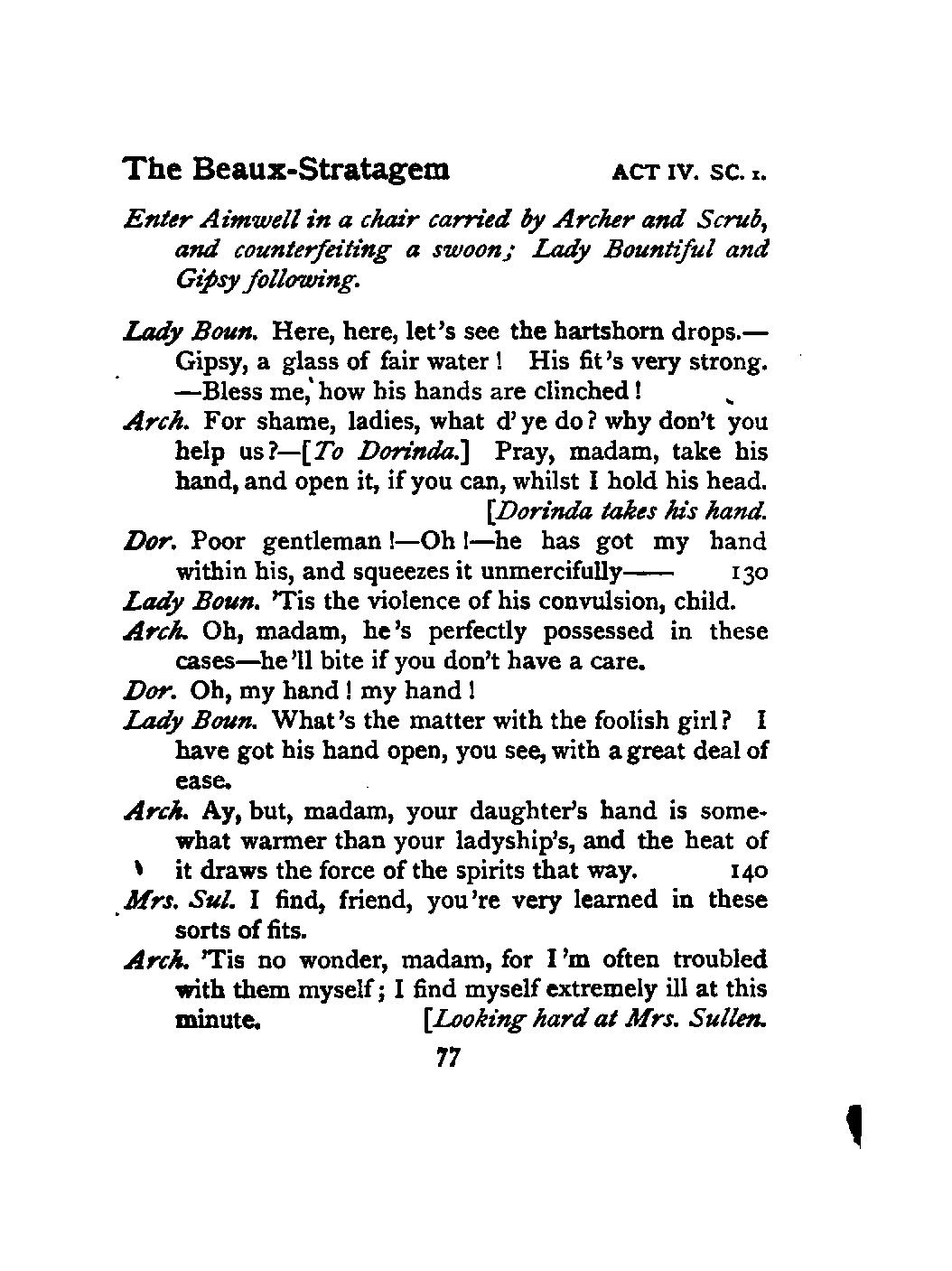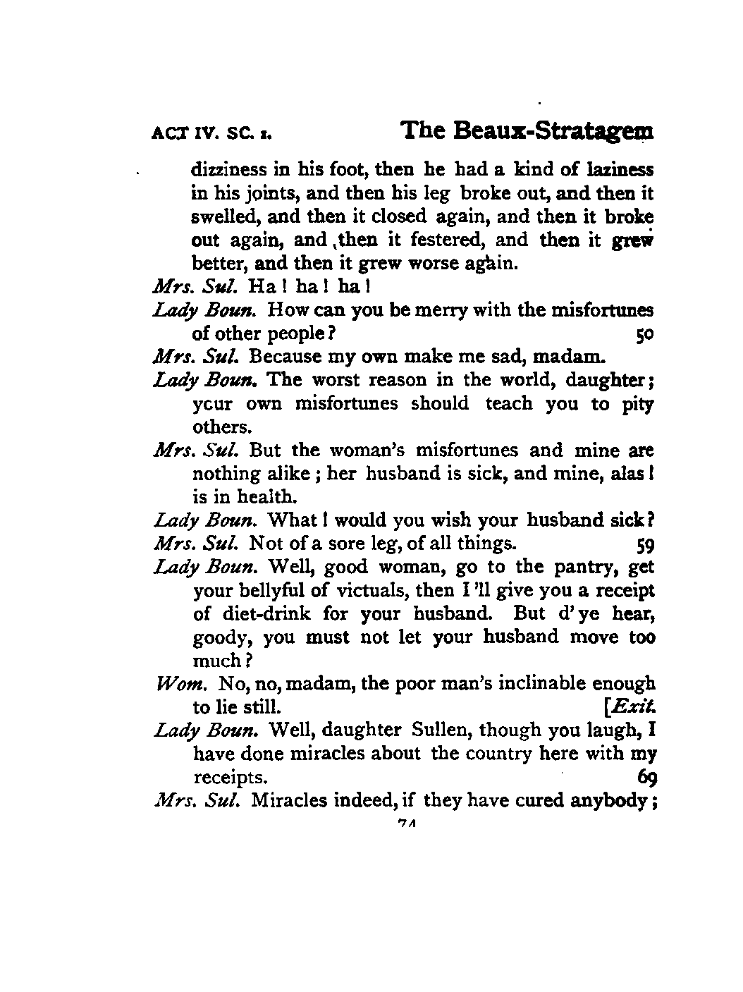 Bon. 'Ods my life, sir, we'll drink her health.—[Drinks.] My Lady Bountiful is one of the best of women. Her last husband, Sir Charles Bountiful, left her worth a thousand pound, a year; and, I believe, she lays out one-half on't in charitable uses for the good of her neighbours. She cures rheumatisms, ruptures, and broken shins in men; green-sickness, obstructions, and fits of the mother, in women; the king's evil, chincough, and chilblains, in children: in short, she has cured more people in and about Lichfield within ten years than the doctors have killed in twenty; and that's a bold word. [84]