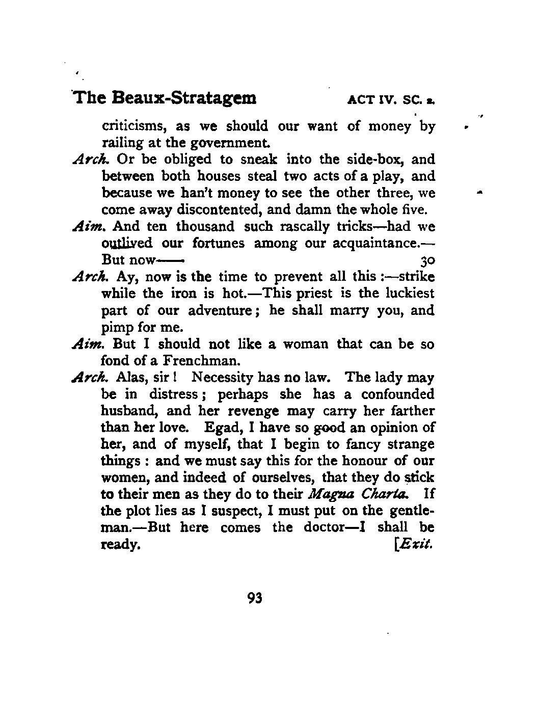 Arch. Don't mistake me, Aimwell, for 'tis still my [11]maxim, that there is no scandal like rags, nor any crime so shameful as poverty.