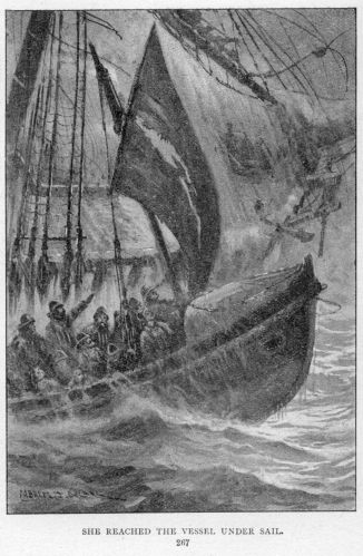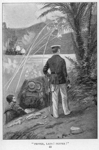 It appears that the enemy had come down in great force to attack the boats from that side; and as the river was there very shallow, and the bottom hard, they could, by wading not more than knee-deep, have approached to within five or six yards of them. But in the first attack they had lost a good many men, and it is supposed that their repeated advances during the night were more to recover their dead and wounded, than to make any attack on the compact little force of British, whose deadly aim and rapid firing had told with such effect, and who certainly were, one and all, prepared to sell their lives as dearly as possible. For some object, the enemy had begun felling some large trees, and their torches showing their position, Mr Partridge kept up a hot fire on them from the pinnace, till a signal rocket fired among them made them take to flight. Two natives and one marine of the British party were wounded; and the latter poor fellow, a gallant young officer named Jenkins, already distinguished in the Chinese war, volunteered to convey in the second gig, with four boys only, down to the Jolly Bachelor. He performed his duty, and was again up with the party before daylight.