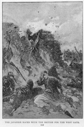 At this juncture, Lieutenant Fitzjames brought up some rockets and lodged one in a guard-house, which, catching fire, threw the enemy into such consternation that they gave way, followed by Captain Richards, who, at the head of his men, had jumped down into an open space between two gateways. At the same moment the gate was blown open by powder bags; and Sir William Parker, with the third brigade under General Bartley, accompanied by Sir Hugh Gough, dashed over its ruins. Several officers and a large number of men suffered from the effects of the hot sun. The Naval Brigade having in consequence rested for some time in a guard-house, on hearing some firing, again sallied out, when they were met by a sudden fire from a body of Tartars, drawn up across a street behind a small gateway. Here Lieutenant Fitzjames was wounded, as were several of the men.