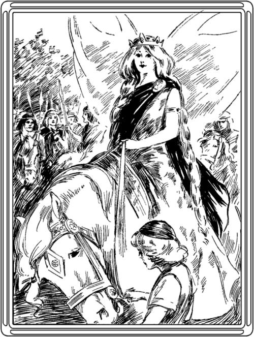 Connla helped up Nora, and then climbed on to the little steed himself; and as soon as they were properly seated the little man said "swish," and away went the steed, galloping over the sea without wetting hair or hoof. But fast as he galloped the nine little pipers were always ahead of him, although they seemed to be going only at a walking pace. When at last he came up rather close to the hindmost of them the nine little pipers disappeared, but the children heard the music playing beneath the waters. The white steed pulled up suddenly, and wouldn't move a step further.