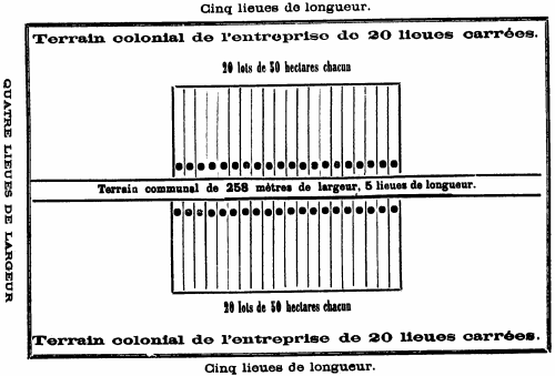 Art. 99.—Relatif aux entreprises.—Entre section et section subdivisées et livrées à la population, il sera réservé une section (25 lieues carrées) sans être divisée, mais bornée sur ses côtés. Ces sections seront destinées: