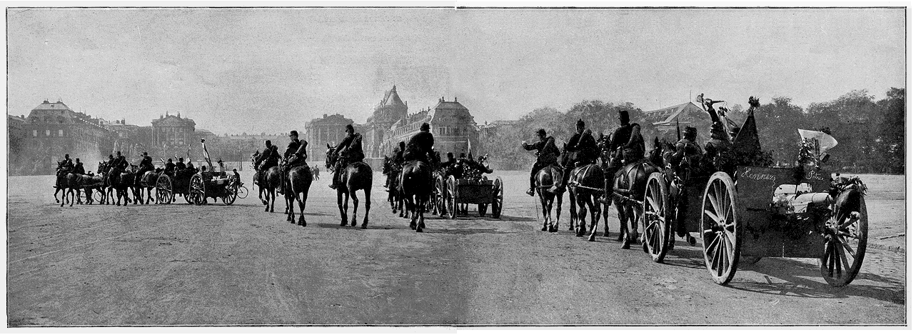 Tout le jour, des curieux bien sages, presque recueillis, défilèrent, en rangs pressés, devant cette enseigne captive. Le soir elle fut présentée au président de la République, et passa la nuit à l'Elysée dans la chambre de l'officier de service. Le lendemain matin elle était conduite aux Invalides, où elle ne sera qu'un trophée de plus, perdu dans la masse de ceux qui flottent autour du dôme glorieux. Une compagnie de la garde républicains lui faisait escorte.