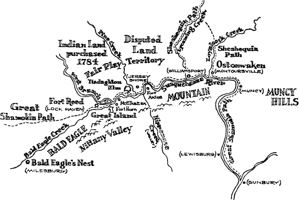 The Fair Play territory of the West Branch Valley of the Susquehanna River, the setting for this analysis, was part of what Turner called the second frontier, the Allegheny Mountains.[3] Located about[Pg 2] ninety miles up the Susquehanna from the present State capital at Harrisburg, and extending some twenty-five-odd miles westward between the present cities of Williamsport and Lock Haven, this territory was the heartland of the central Pennsylvania frontier in the decade preceding the American Revolution.
