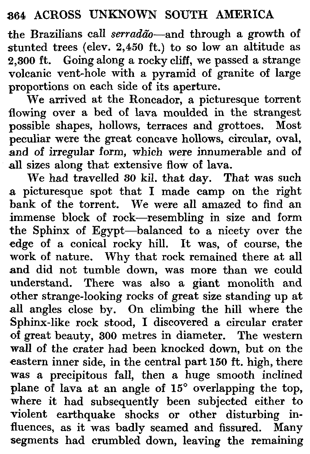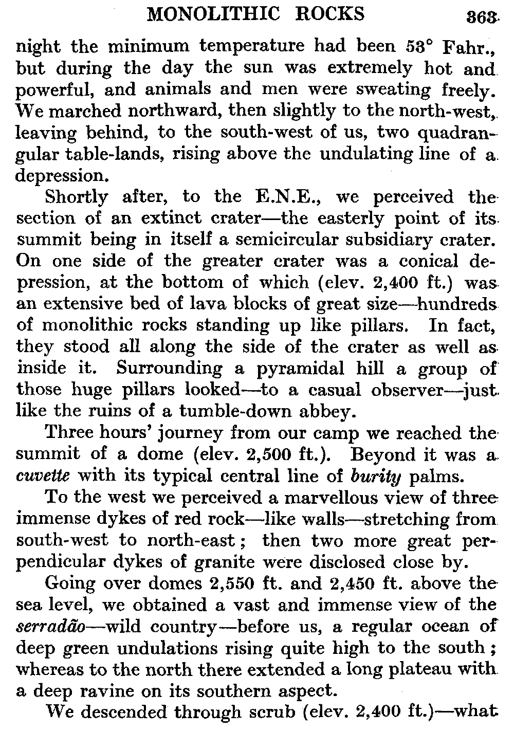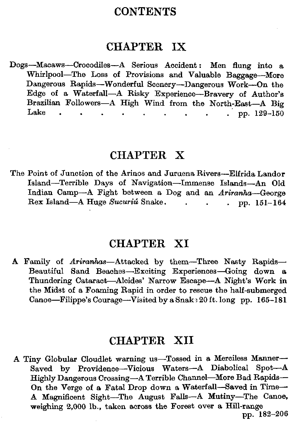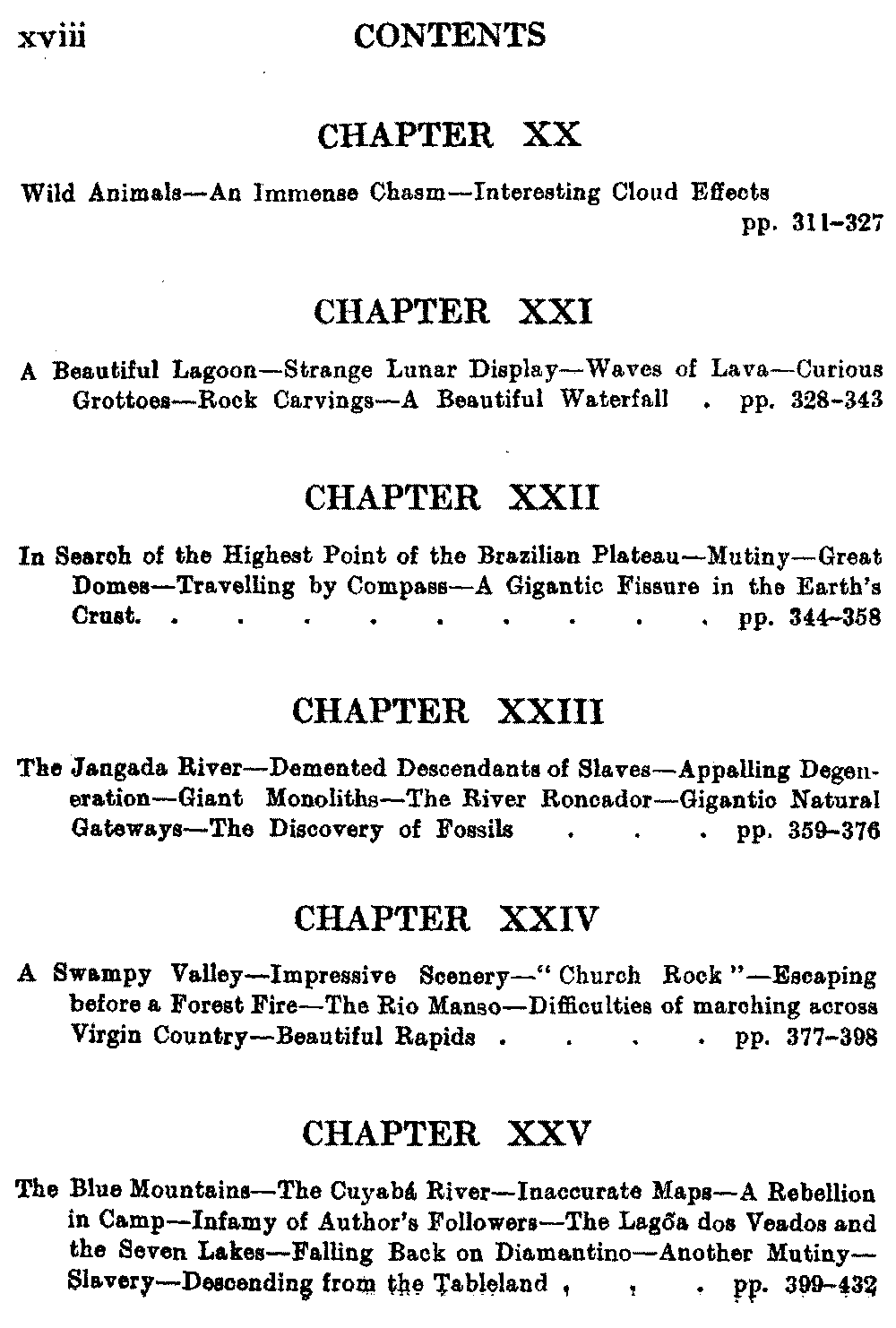 | XXIII | The Jangada River—Demented Descendants of Slaves—Appalling Degeneration—Giant Monoliths—The River Roncador—Gigantic Natural Gateways—The Discovery of Fossils | 359-376 |