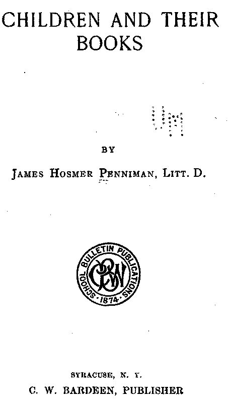 Project Gutenberg's Children and Their Books, by James Hosmer Penniman This eBook is for the use of anyone anywhere at no cost and with almost no restrictions whatsoever. You may copy it, give it away or re-use it under the terms of the Project Gutenberg License included with this eBook or online at www.gutenberg.org Title: Children and Their Books Author: James Hosmer Penniman Release Date: September 15, 2007 [EBook #22604] Language: English Character set encoding: ISO-8859-1 *** START OF THIS PROJECT GUTENBERG EBOOK CHILDREN AND THEIR BOOKS *** Produced by Suzanne Lybarger and the booksmiths at http://www.eBookForge.net