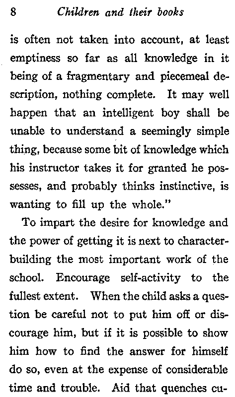 "The emptiness of a young boy's mind[8] is often not taken into account, at least emptiness so far as all knowledge in it being of a fragmentary and piecemeal description, nothing complete. It may well happen that an intelligent boy shall be unable to understand a seemingly simple thing, because some bit of knowledge which his instructor takes it for granted he possesses, and probably thinks instinctive, is wanting to fill up the whole."
